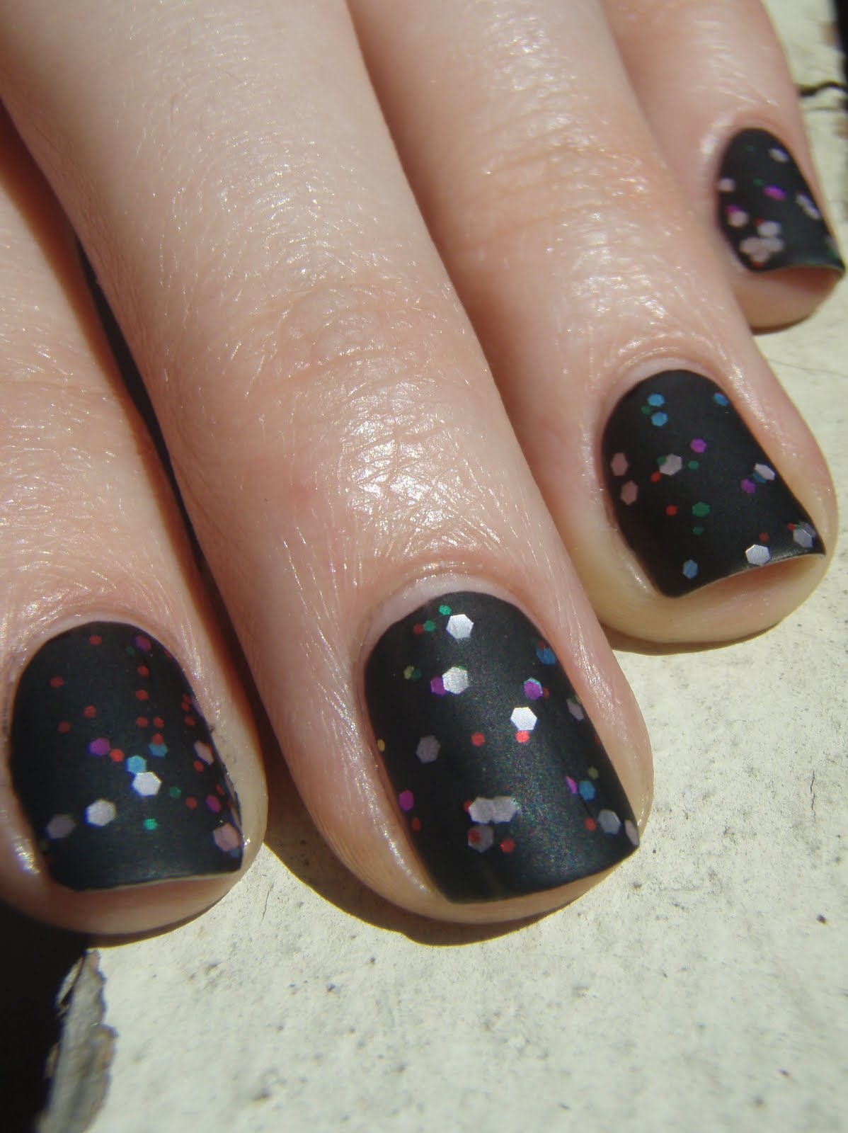 mom and i tried this the other weekend and mine didn't turn out as well… i think/know i put too many coats of the party of five on so it was like a glitter overload instead of looking more like stars in the sky, which i think yours looks like here. we also used a blue matte, not a black. how did you get it to not turn glossy when you put the party of five over the matte? did you just use a very thin coat?