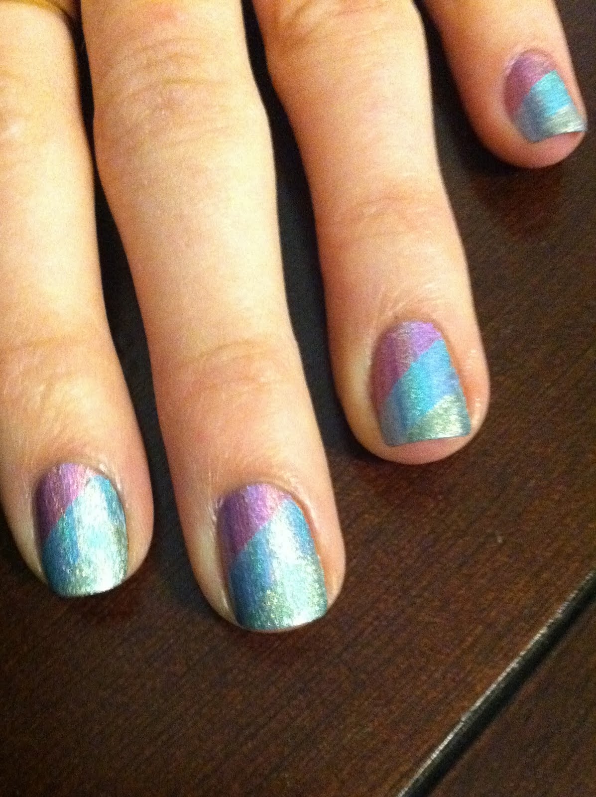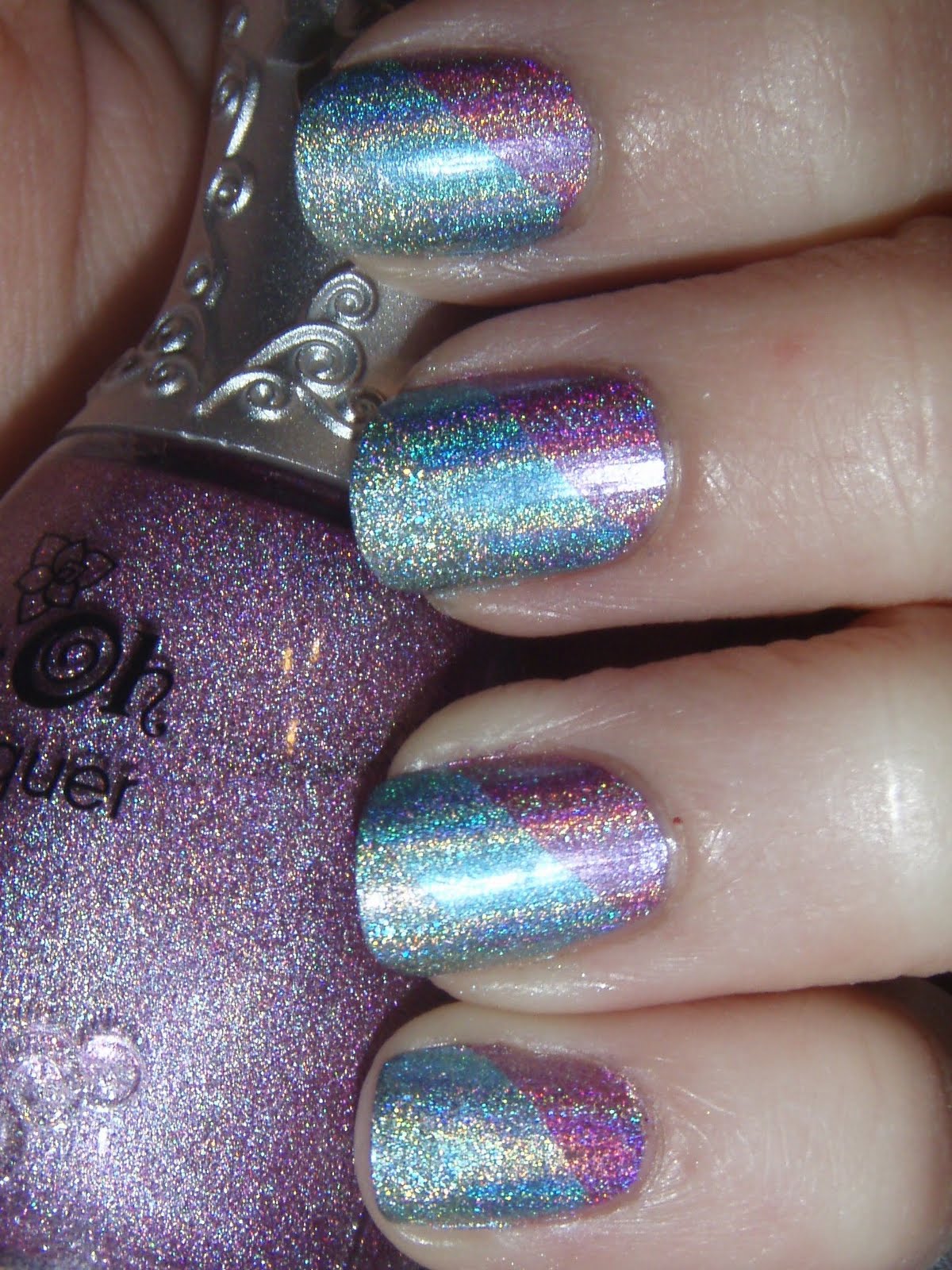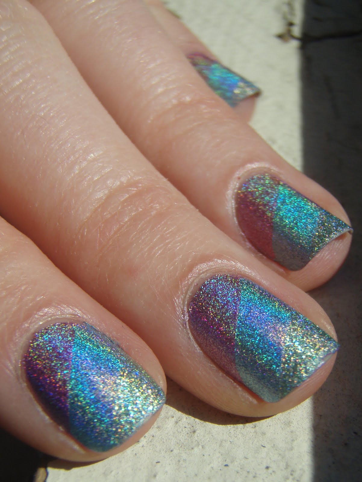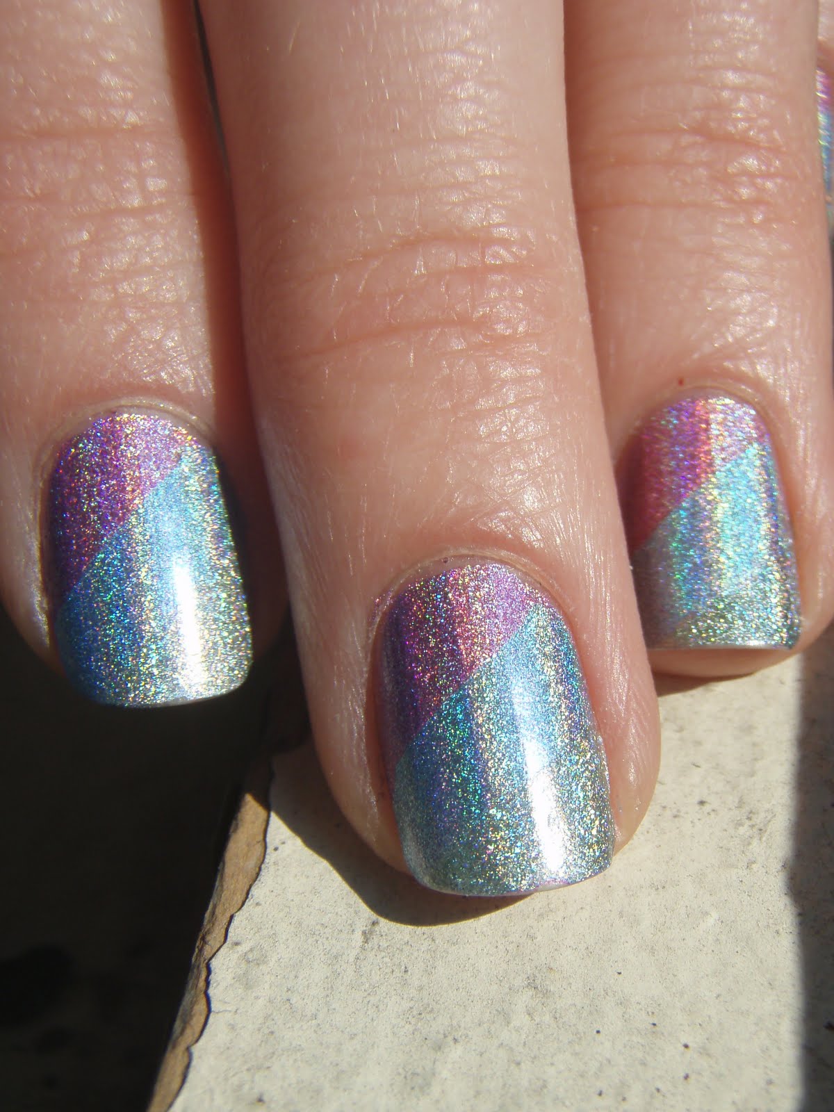 So, I just LOVE holographic nail polish. My good friend, Heidi, got some of the Nfu-Oh holos yesterday and invited me over to try them out. I am in love!! I did a tape mani with her purple-pink(#64) and blue(#65) holo, combined with my light green China Glaze one. I took a ton of pictures so enjoy!