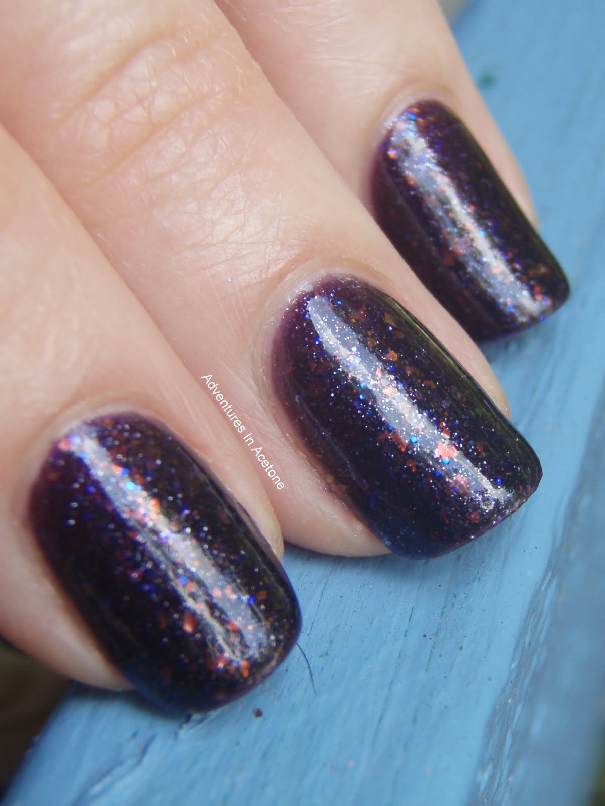 A deep purple shimmery jelly with itty bitty blue glitter and copper colored flakies! I love them all together. These pictures are of 3 coats over Nail Envy, and topped with Poshe.