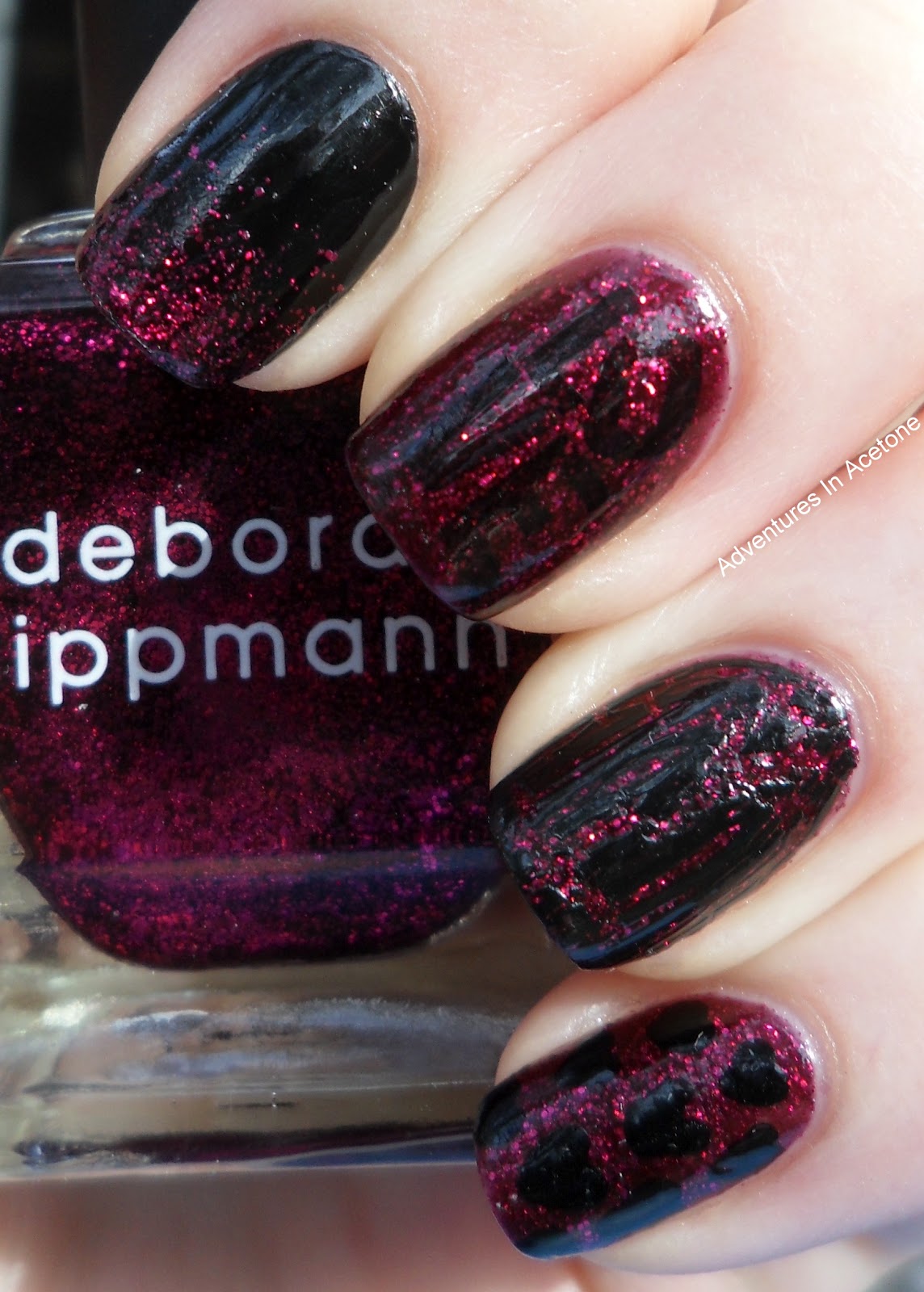 Good morning, readers!! I got so many amazing polishes in my nail mail post but couldn’t help but try out the Deborah Lippmann first. How could I pass that beauty up?? I decided I wanted to do some fun “skittle” nails with different designs on each one with black and Razzle Dazzle. Razzle Dazzle is an amazing glitter polish, it’s one of my favorite glitters now! There is such depth to the polish with different sized glitters in the raspberry colored jelly base. Love. It really looks like it glows in person!