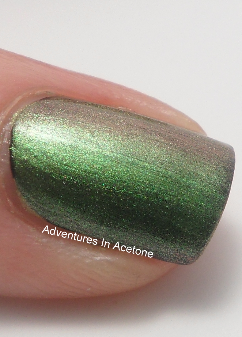 Next up is Super Green! I like this so much more than I expected to, and the duochrome over black was a surprise to me! From it’s Etsy listing, it’s a “acid green with darker green shimmer verging on a metallic orange.” Again, I’m showing over black, white, and on it’s own with no top coat.