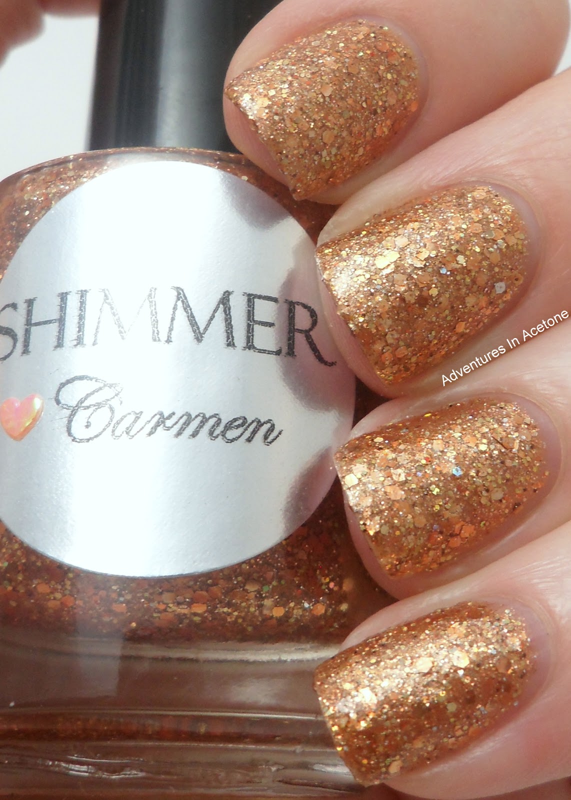 Next, we have my favorite of this group, Carmen! I was totally shocked at my love for Carmen once it was on my nails. I’m usually drawn to teals, blues, and purples. Carmen is a holographic copper glitter bomb! It’s very close to Alice, but in copper instead of silver. SO IN LOVE. Shown below with only 2 coats. Definitely more holographic than these pictures show.