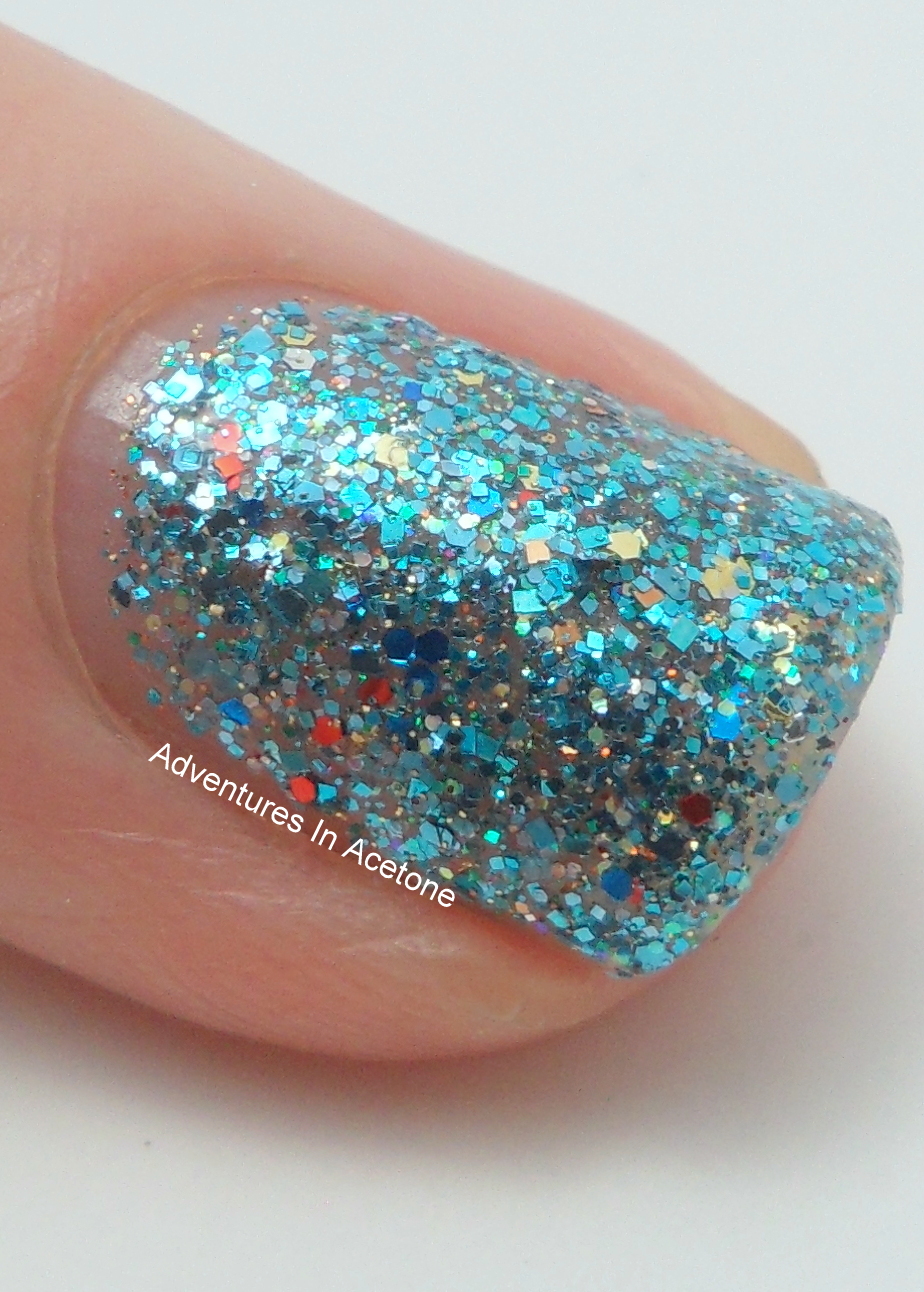 Now for Caroline. Tons of color glitters, purples being the main focus. Shown below as three coats.