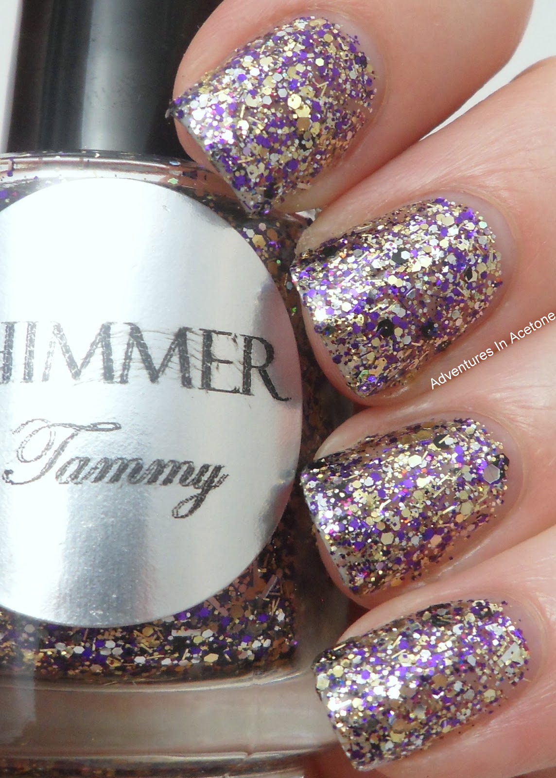 Next we have Tammy. This is the only one I’ve tried with bar glitters. A very interesting color combination as well. Gold, silver, purple, black, as well as some others not as prominent. This is 2 coats below!