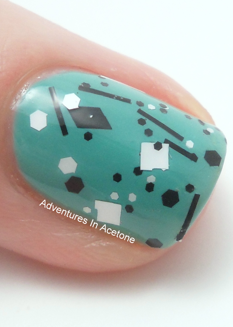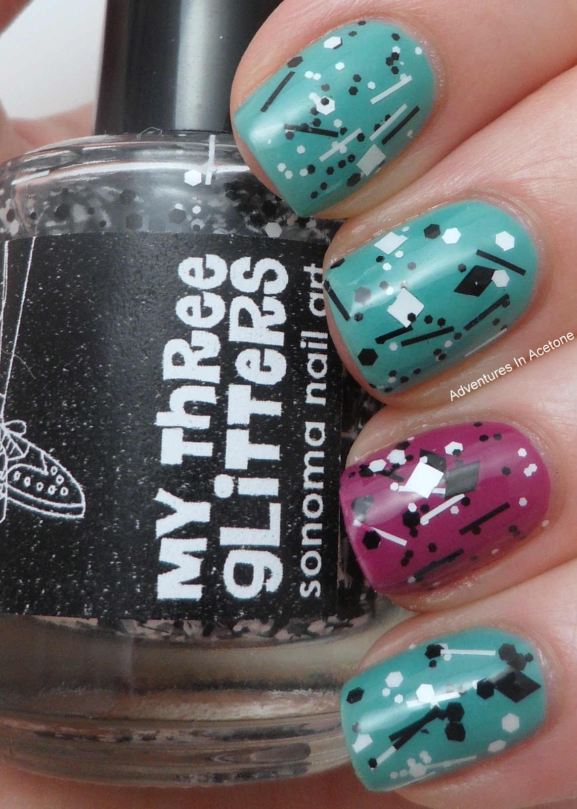 Sonoma Nail Art My Three Glitters is a super awesome mix of black and white bars, squares, rhombuses, and different size hexes. It applied easily and I only had to fuss with the bar glitter so it wouldn’t hang off the edge of the nail. I chose to do 2 coats for more even coverage and love how it turned out!