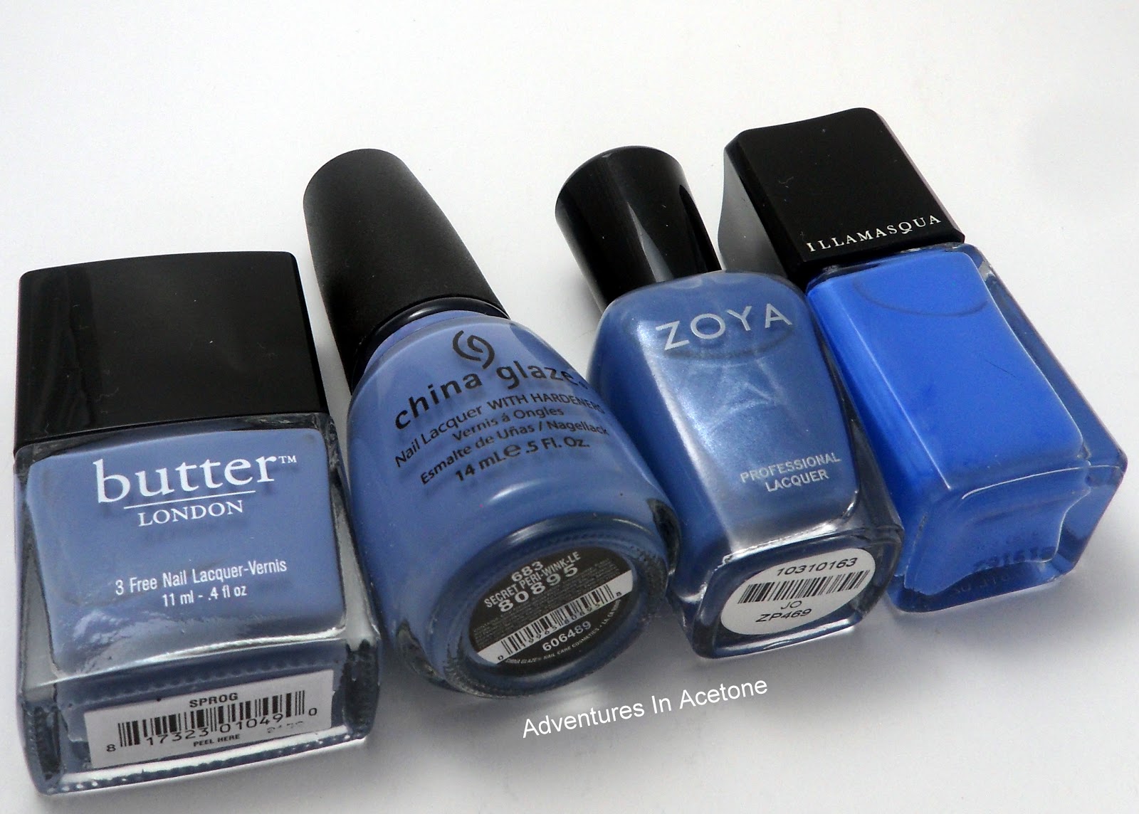 Today’s comparison post is on periwinkles. I was wondering how close Butter London Sprog was to China Glaze Secret Peri-wink-le before I got it in a swap and it turns out they are pretty close. I also recently got Zoya Jo and Illamasqua Cameo so I threw those into the comparison as well!