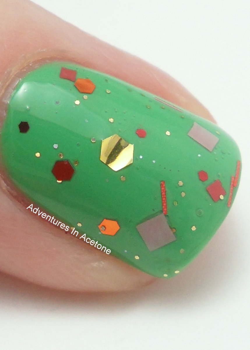 Tequila Sunrise is next! I love this combo of glitters/colors! Hexes, squares and bars in golds, oranges, pinks, reds. The clear jelly base was thicker than the others but the glitter was nicely suspended in it. This is one coat over Essie Mojito Madness. Unfortunately, the big gold hexes are curling. They were okay with top coat, but this would be an awesome polish even without them. Shown with top coat.