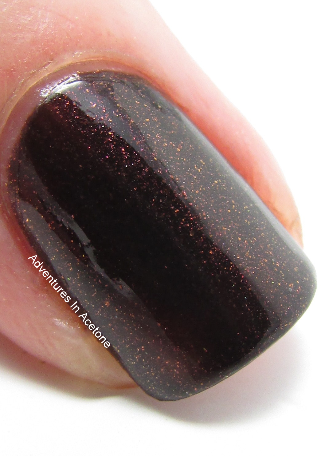 Smolder is described as “a blackened plummy brown with a pink/red/bronze shimmer.” That shimmer is definitely color changing depending on the angle to the light and is really pretty! I used two coats with one coat of top coat below.
