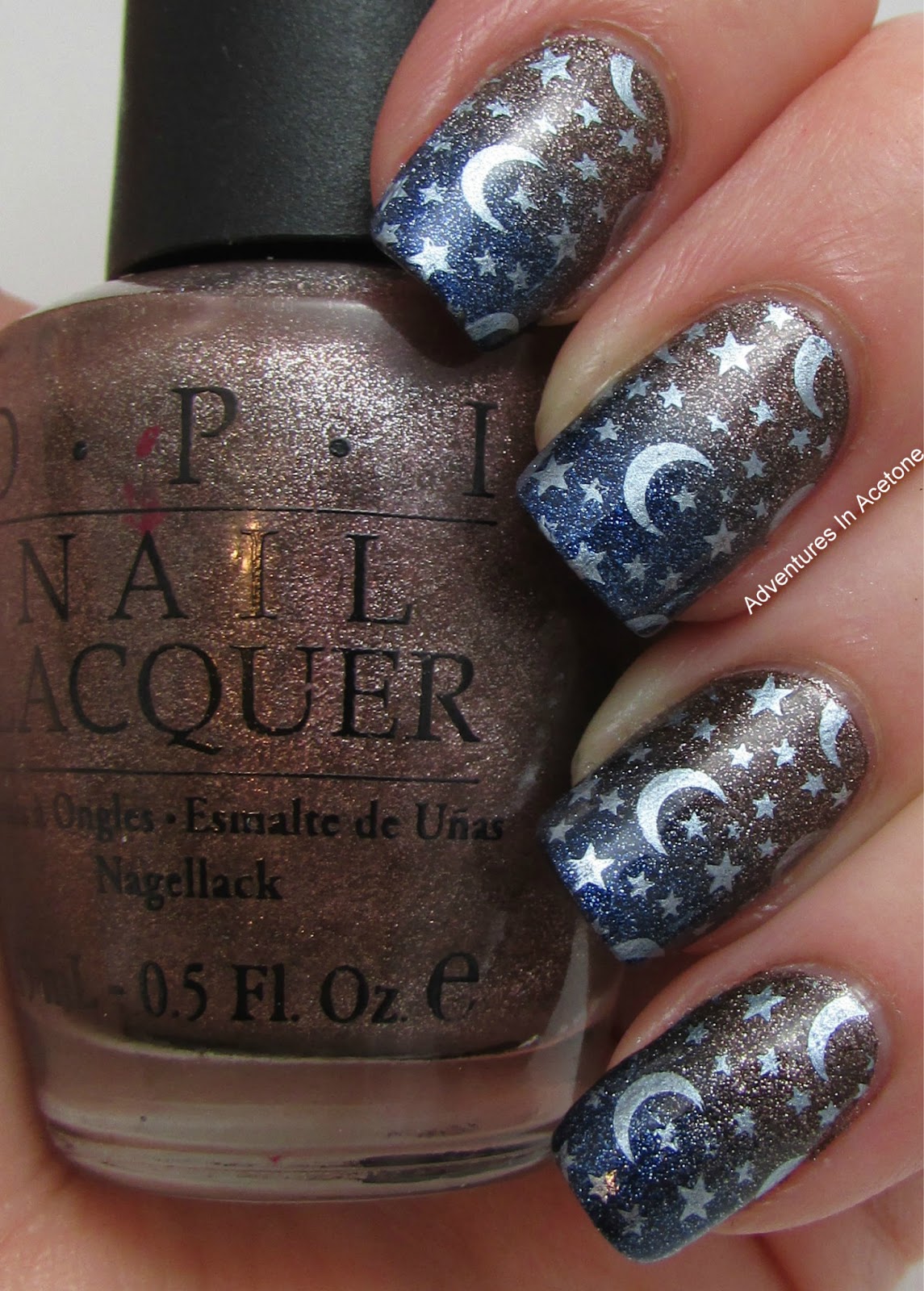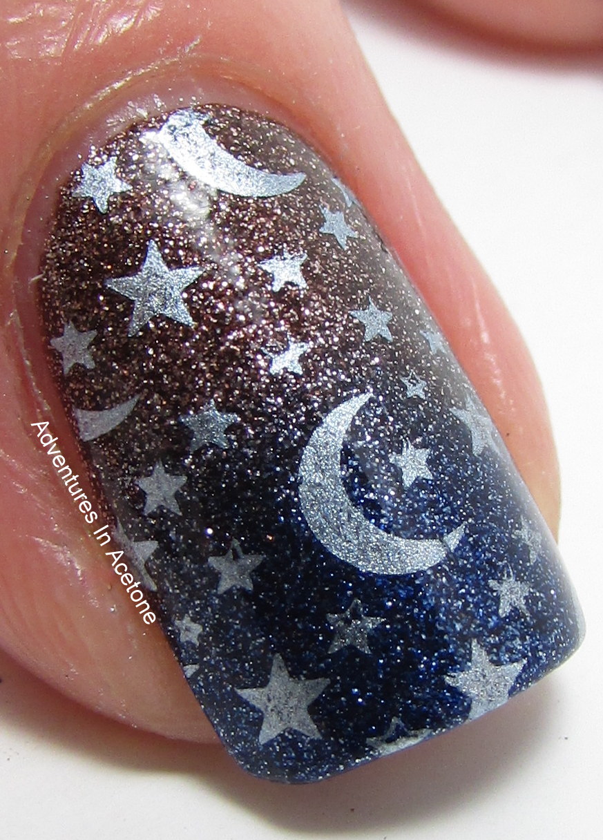 Are you ready to see what I’ve done with the moon and star design from plate CH46? I chose to do a gradient of two of my new OPI Suedes and then stamped over it.