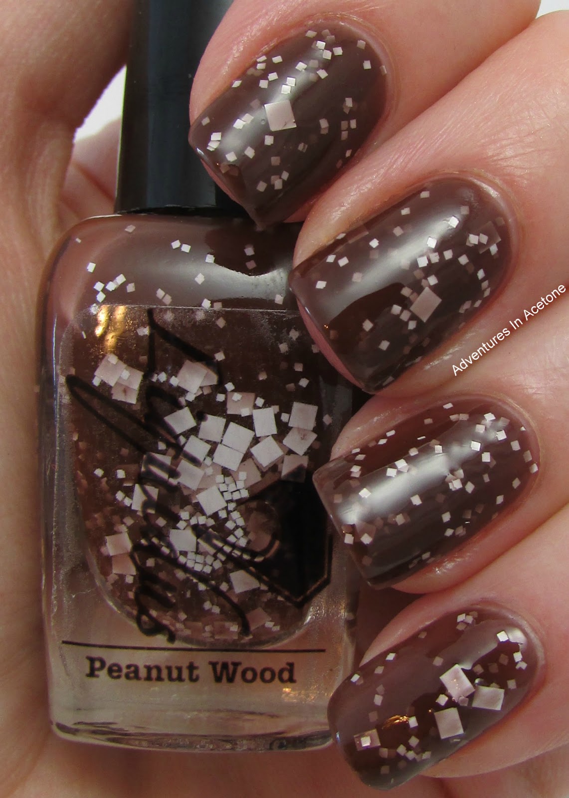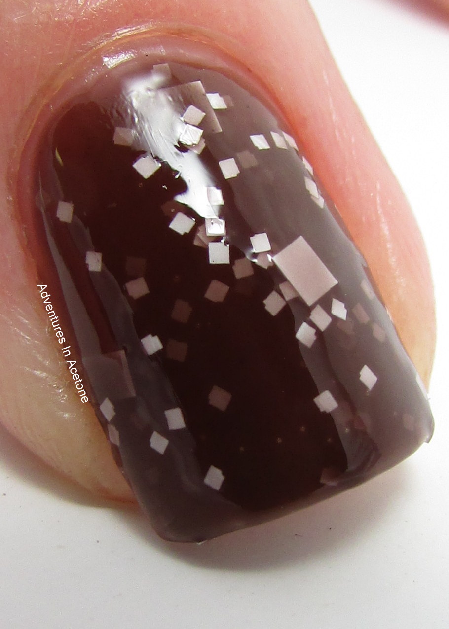 And finally we come to the glitter of the group, Peanut Wood. “Inspired by the brown and white petrified wood,” it is a brown jelly base with two sizes of white square glitters. I loved this one once it was on much more than I expected to. The color combination is really awesome and I loved how the brown base was opaque enough to only need 2-3 coats and yet sheer enough to not cover the white glitter too much and make them muddy looking. I’m showing 3 coats below with top coat and have no issues to report. I didn’t really have to dig for the bigger glitter and they covered to almost smooth with just one coat of top coat. When I showed this to my husband, he told me it looked like s’mores!