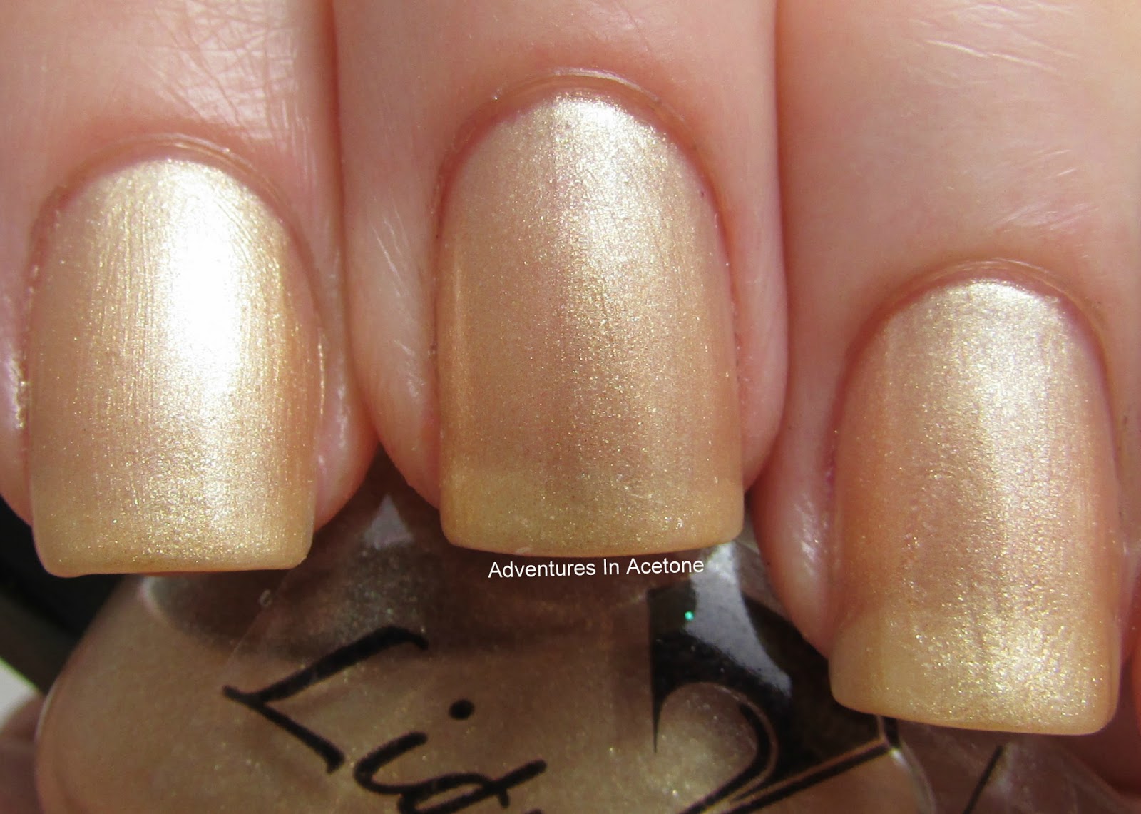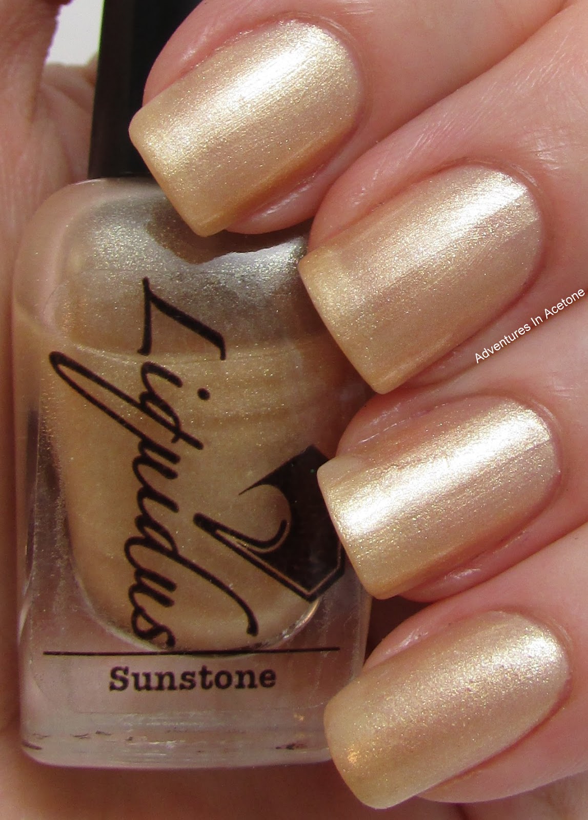 Next up is Sunstone! This is “inspired by the pale translucent gemstone and combines hues of light yellows and pale pinks.” This was also a little frosty but nothing that would deter me from wearing it again. It’s so shimmery and yet subdued and less “in your face” than a typical gold polish. It is a delicate and work appropriate color and even my husband commented on how nice it was. I am showing three coats below with top coat. No issues to report.