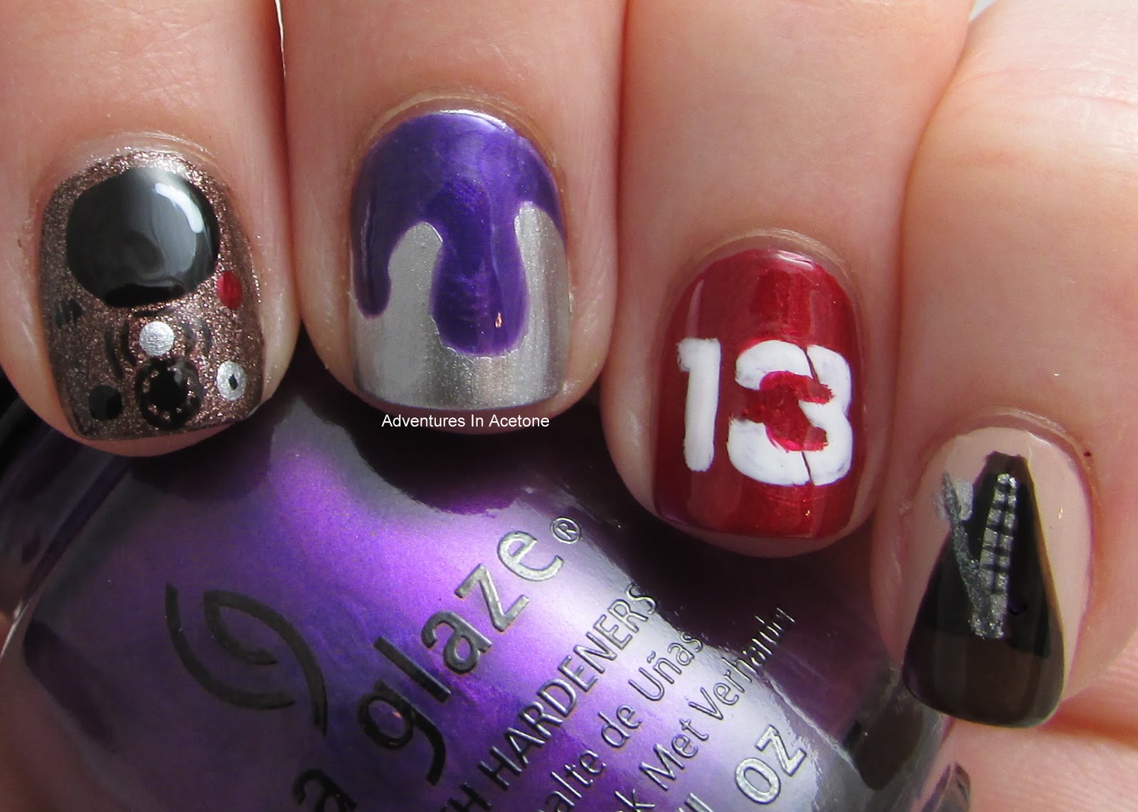 I chose to do 4 different items from the show on each of my fingers. Index: Farnsworth– the “facetime” type cell phone the agents use to communicate with eachother, Middle: dripping purple neutralizer– this is the solution that the active artifacts need to be dipped in to stop the havoc they are causing, Ring: the 13 in the Warehouse 13 logo, Pinky: Johann Maelzel’s Metronome–one of the more important artifacts in the series (it can bring someone dead back to life, the ticking back and forth keeps the person’s heart beating and alive).
