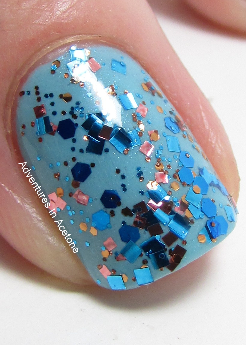 The glitter topper of this duo is called Wyoming Skies. “Blue, caramel, and warm pink glitter in a clear base.” This is a gorgeous combination of glitters and I’m showing one coat below with top coat. Very pretty combo!