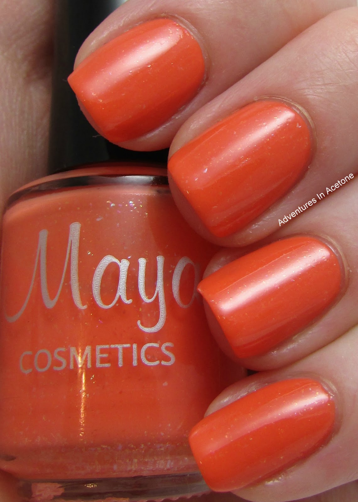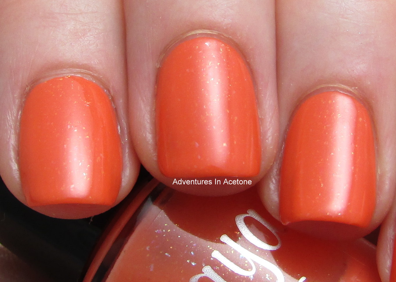 Lastly, we end our Maya Cosmetics marathon with the polish I wore as a full mani after swatching: Parrot Trooper. The name made me giggle when I opened the package and the shimmer is so lovely! It is less red and has a hint of pastel in real life, but I wasn’t able to show the true color in my photos. “Bright coral orange with gold, purple, and light green shimmer flakes” I’m showing two coats below with top coat. LOVE!