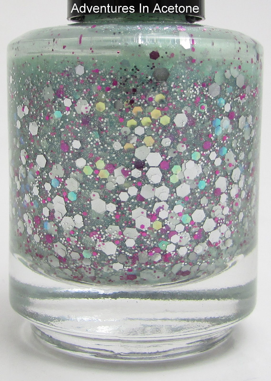 ALL OF TIME AND SPACE is a semi-sheer crystalline minty turquoise with silver shimmer, plus silver and fuchsia glitter.”