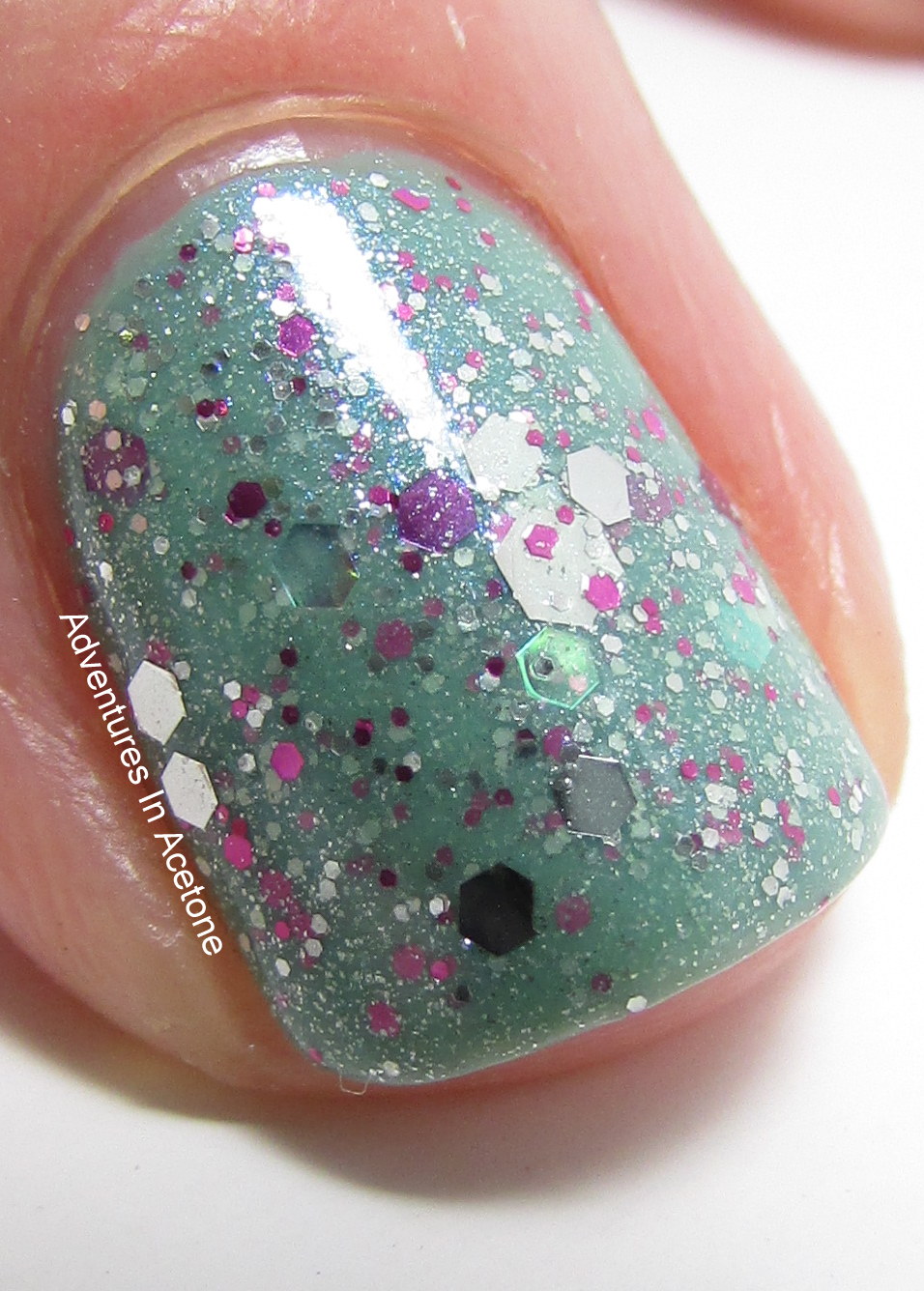 “ALL OF TIME AND SPACE is a semi-sheer crystalline minty turquoise with silver shimmer, plus silver and fuchsia glitter.”