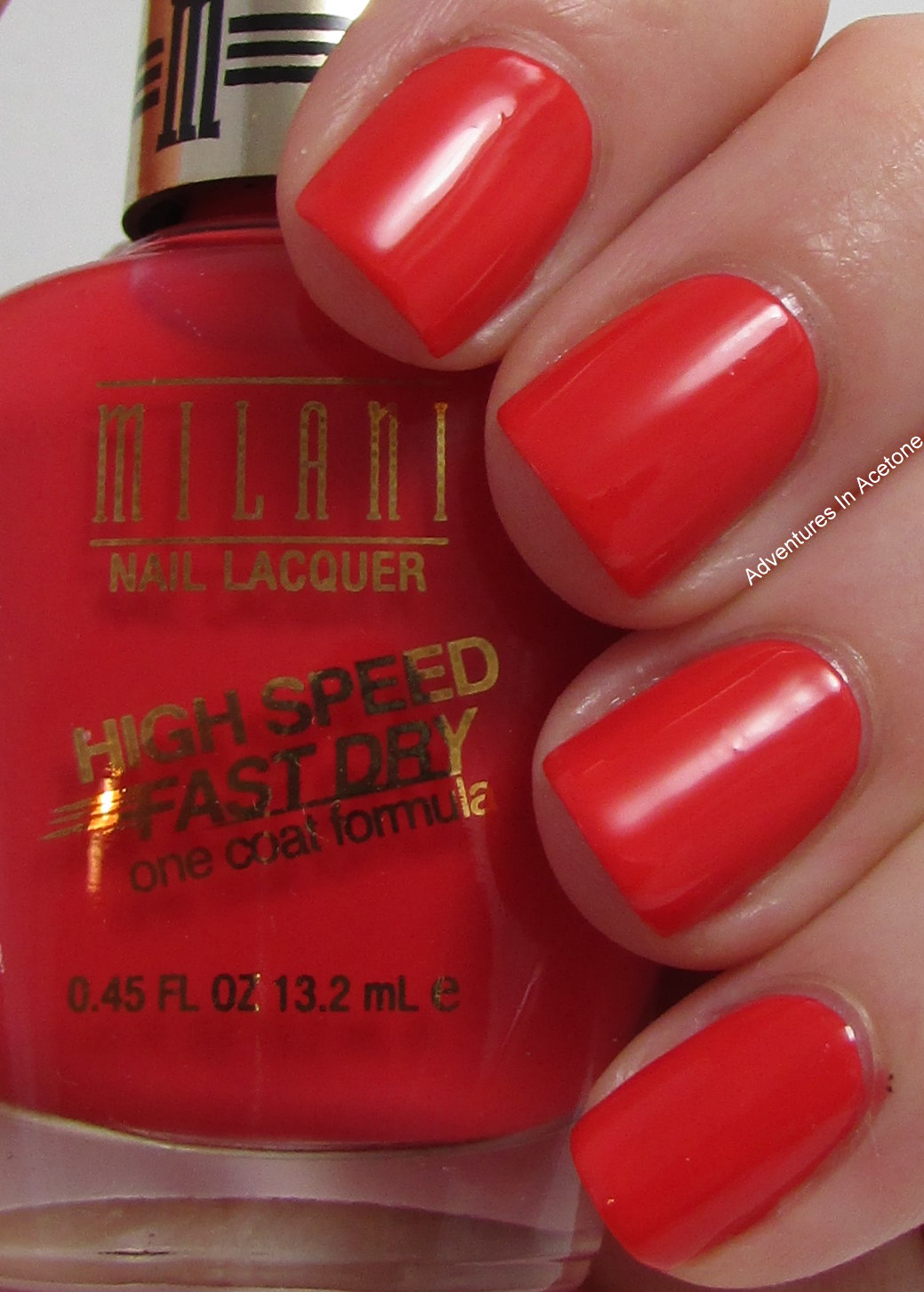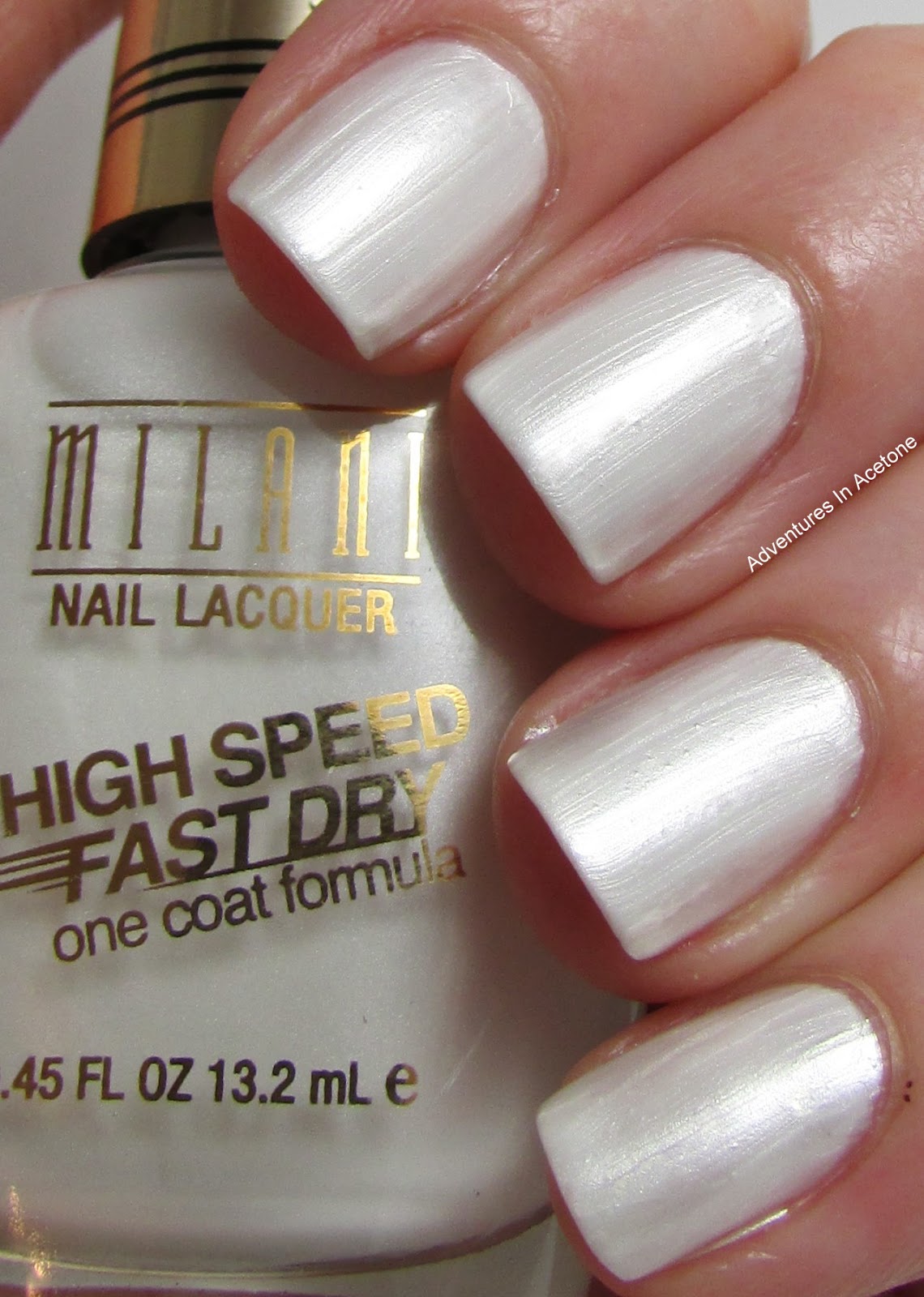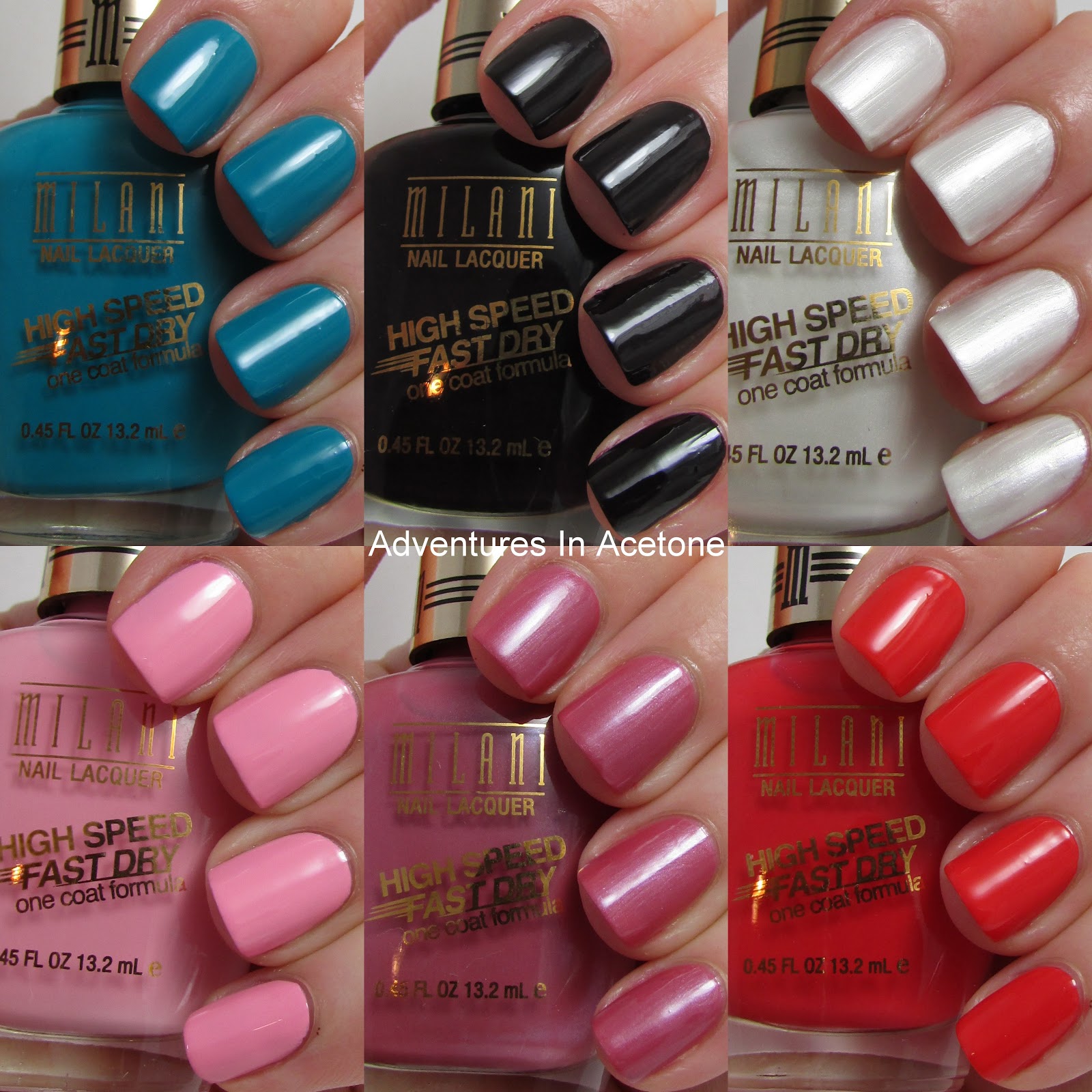 Good morning, readers! I have 6 new Milani High Speed Fast Dry colors to show you today! If you missed them, here is my post to the previous 8 High Speed Fast Dry colors: http://www.adventuresinacetone.com/2012/04/milani-high-speed-fast-dry-swatches-and.html