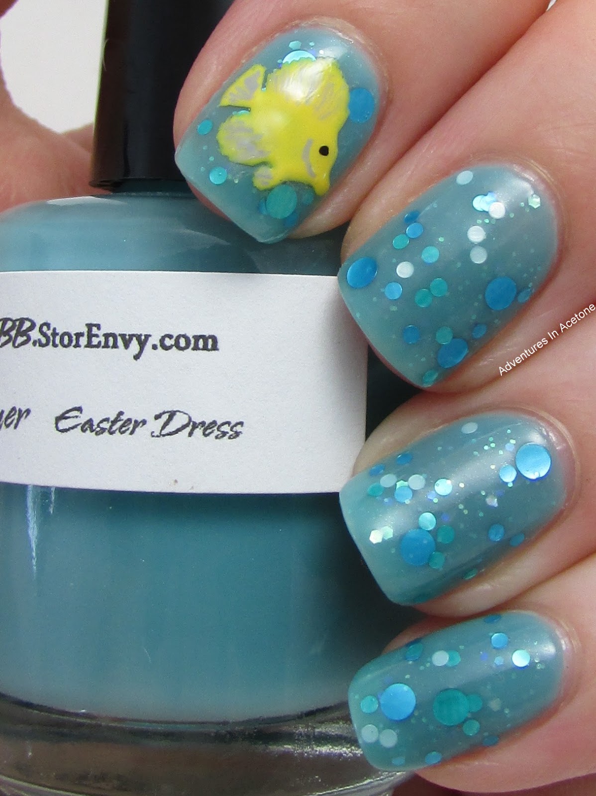 Today, I went with a Yellow Tang fish. After I did this jelly sandwich mani with FEVERlacquer Easter Dress(such a perfect jelly with tons of shimmer!) and Elevation Polish Stay Behind, Catch a Wave, my husband and my friend (Ashley from Ashley Is Polish Addicted) both told me it looked like bubbles in the ocean. We’ve been talking about the Finding Dory (Finding Nemo 2) that was just announced and I remembered that the Yellow Tang was obsessed with bubbles so it only seemed appropriate to add a Yellow Tang to the bubble nails.