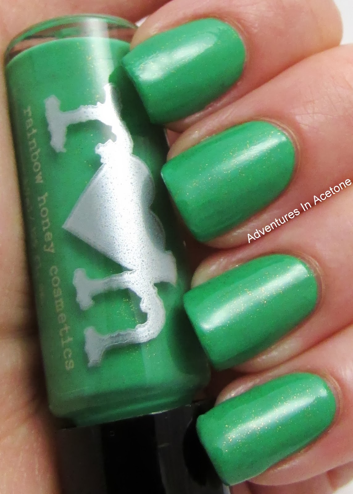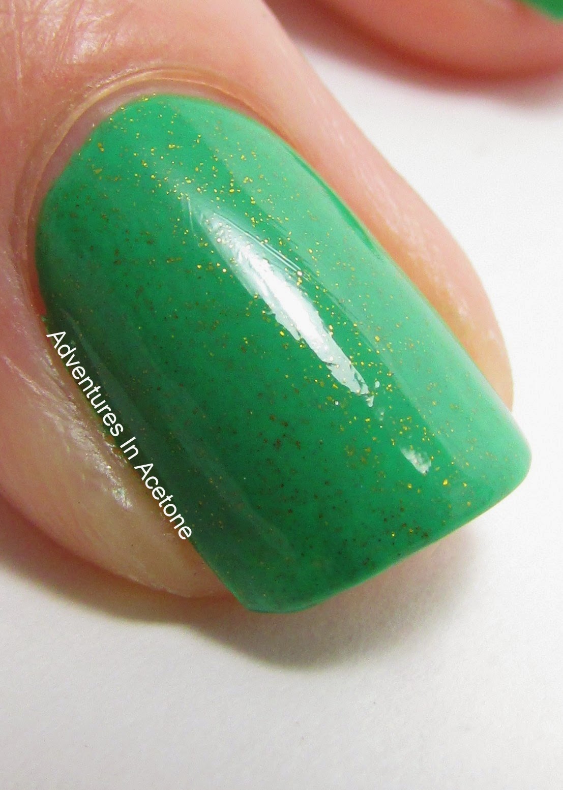 Tenda is a bright kelly green lacquer with golden shimmer. It was thinner than Schrammi and didn’t level out as easily so it took three coats with top coat for the photos below. I can’t get over the gold shimmer in these two! So pretty!