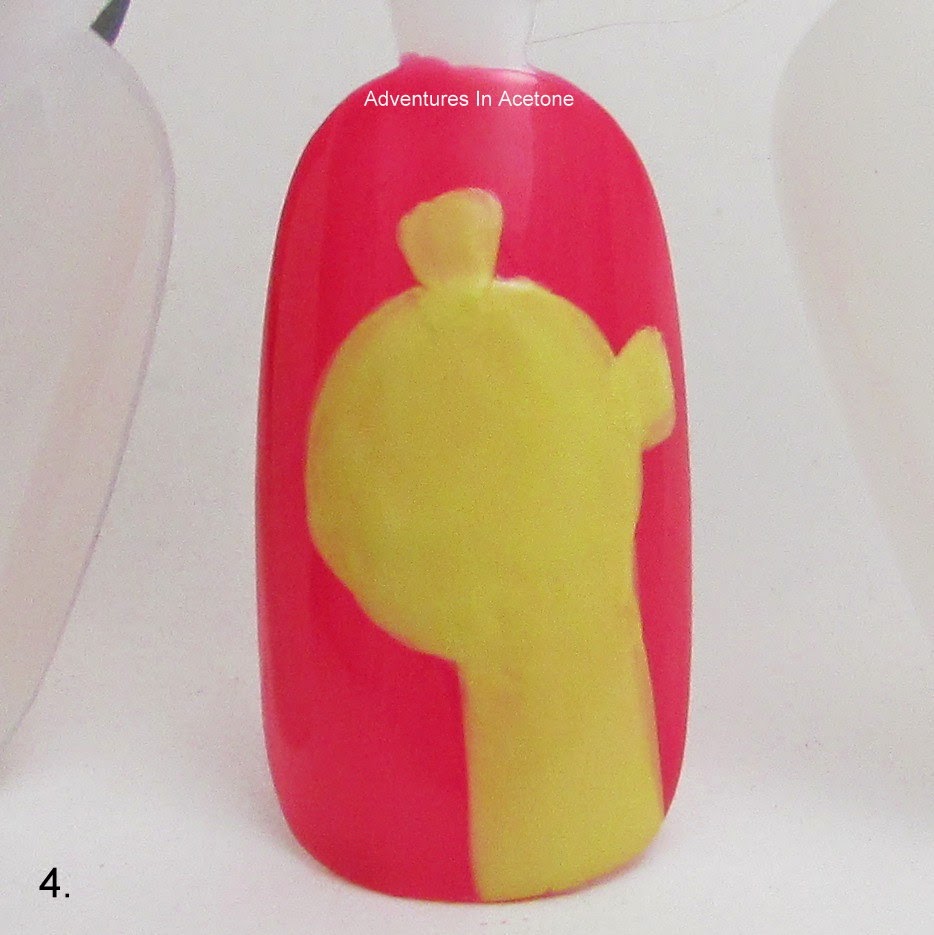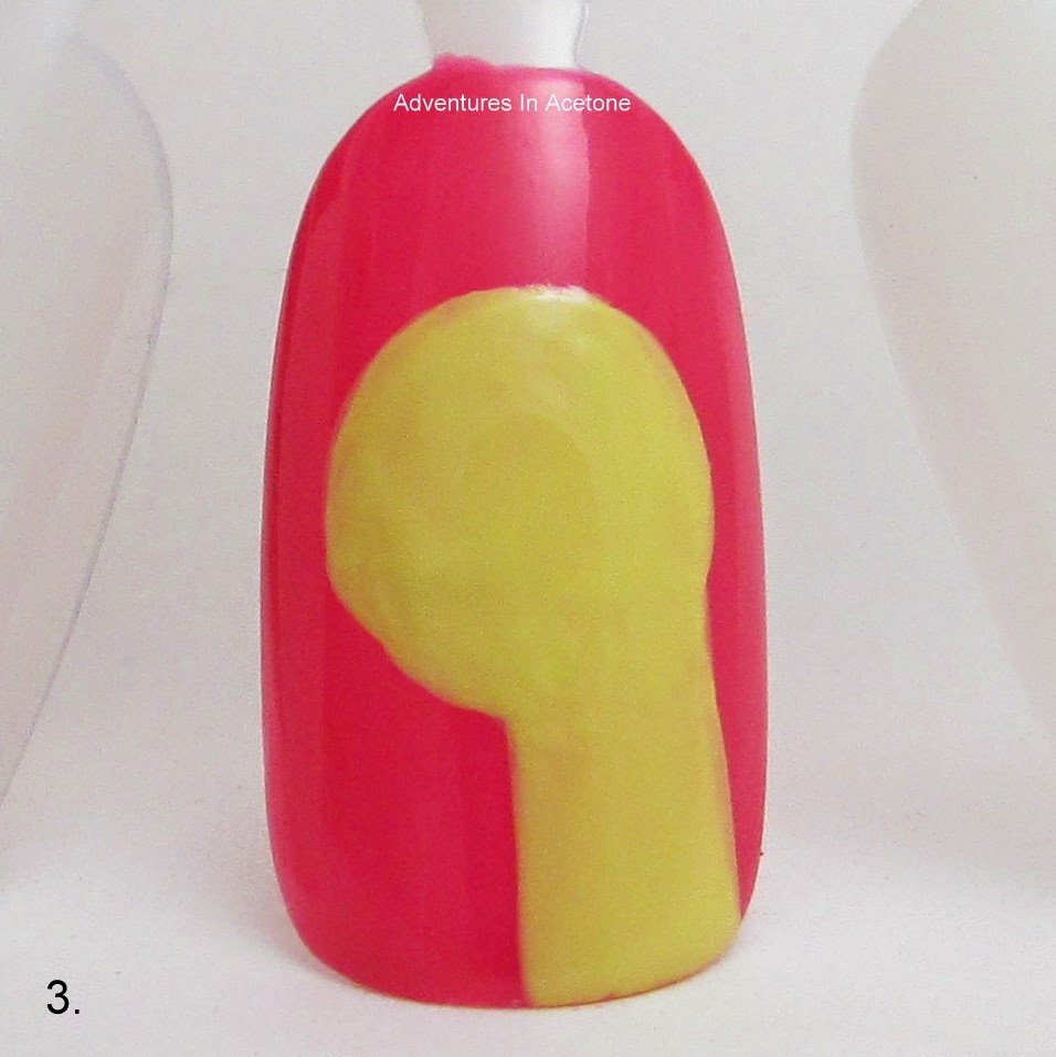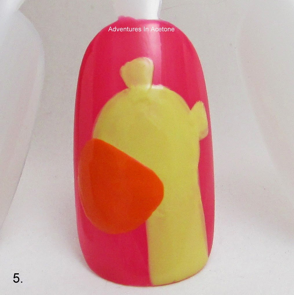 Step 3) Using the striper brush and Orly Lemonade, paint a circle head shape with it over hanging the left side of the neck.