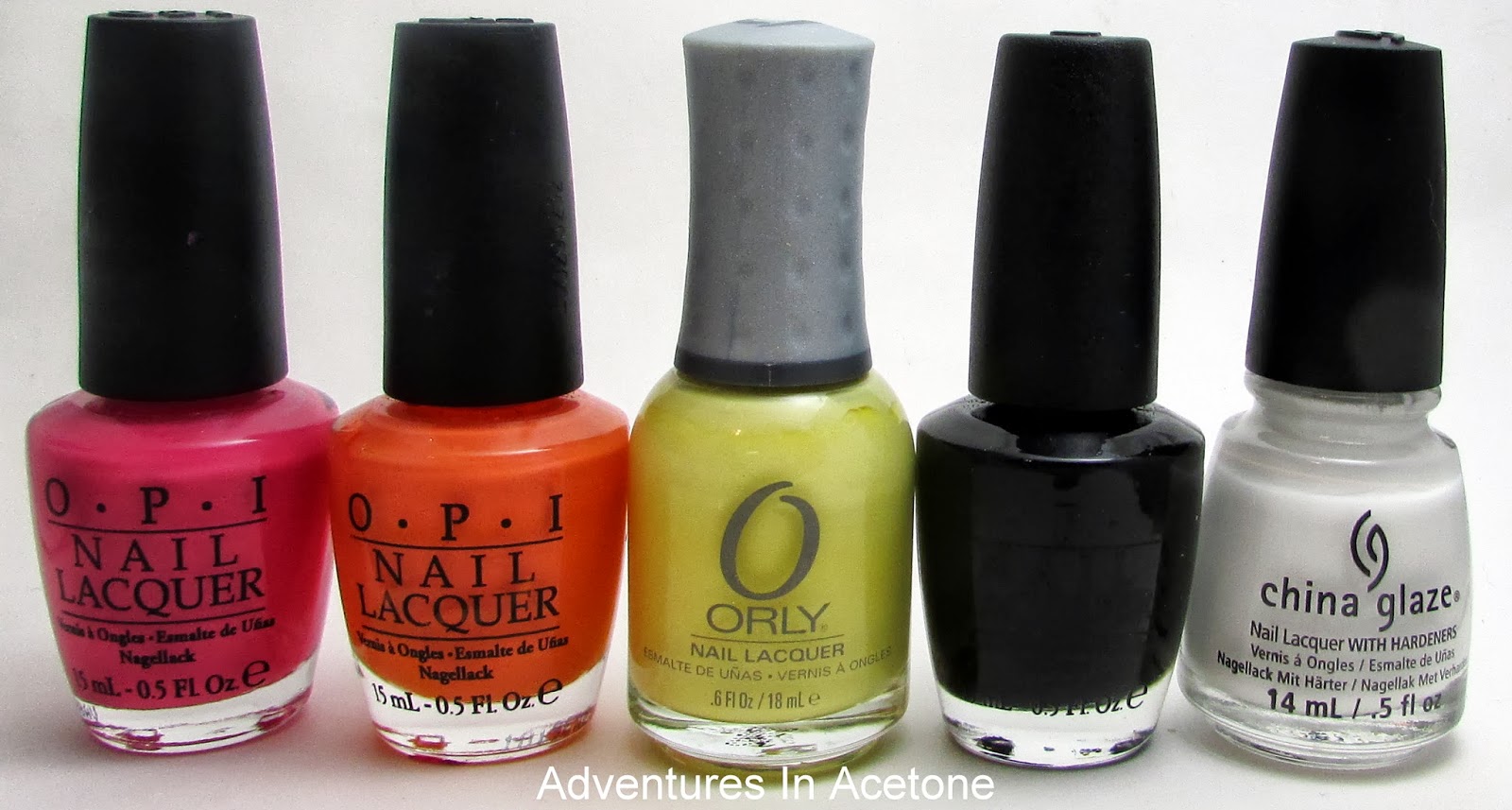 OPI That’s Hot! Pink, OPI In My Back Pocket, Orly Lemonade, OPI Black Onyx, China Glaze White on White.