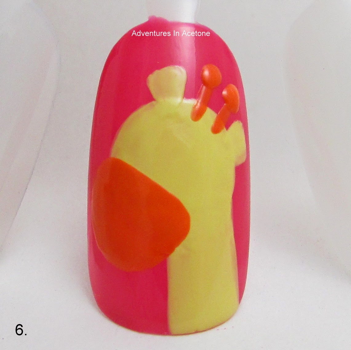 Step 4) Using your striper brush and Orly Lemonade, paint some upside down triangles for the giraffe’s ears.