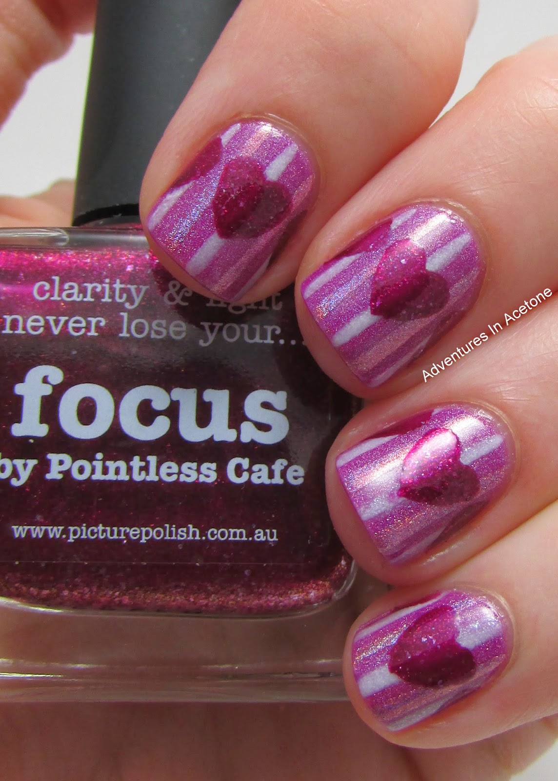 - I filled in the hearts with 2 quick coats of Picture Polish Focus and peeled up carefully before it dried.