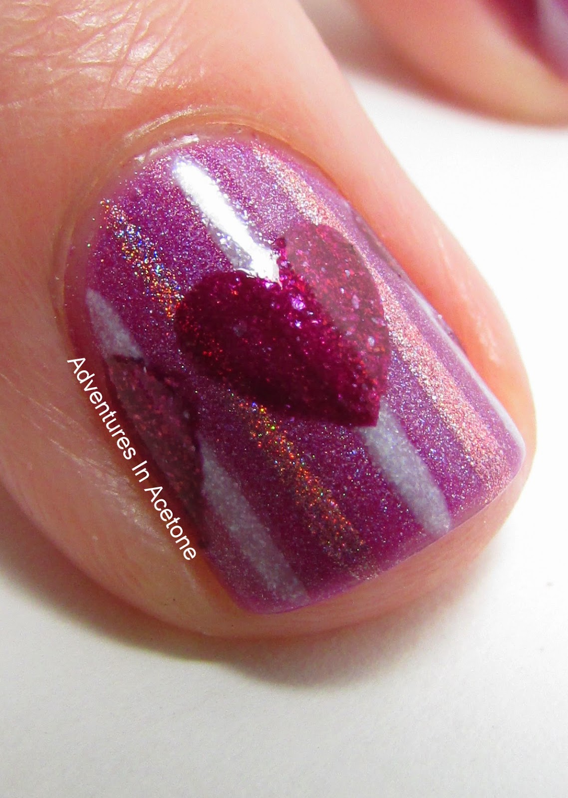 I was inspired by this Chalkboard Nails design using stripes and shapes from hole punches. I decided to go with the heart shaped hole punch and love how it turned out! It is very Anniversary or Valentine’s Day appropriate.
