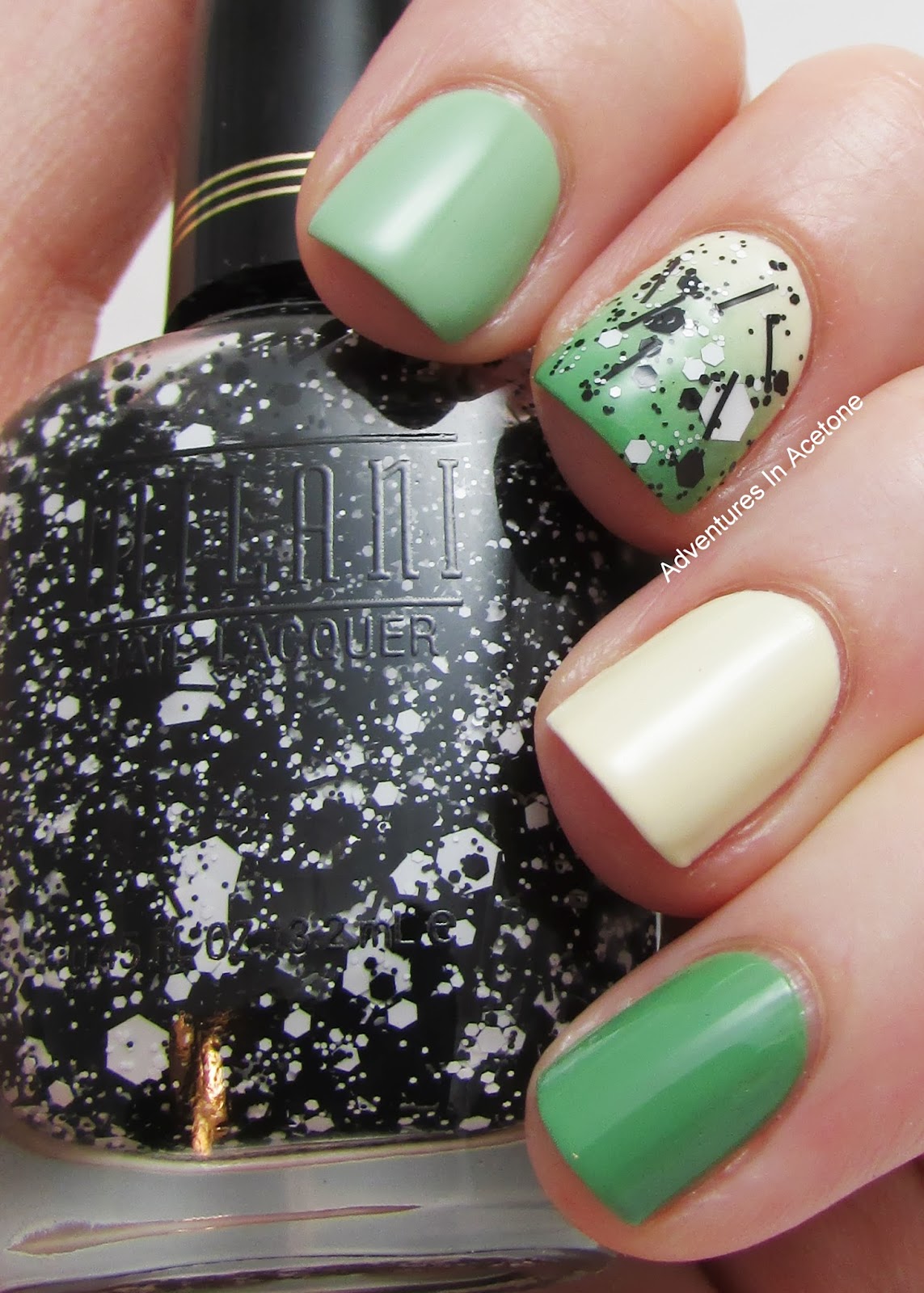 This green mani uses Creamy Pistachio on the index finger, Almond Bliss on the ring finger, Mint Chip on the pinky, and a gradient of all three topped with Sprinkles on the middle finger.