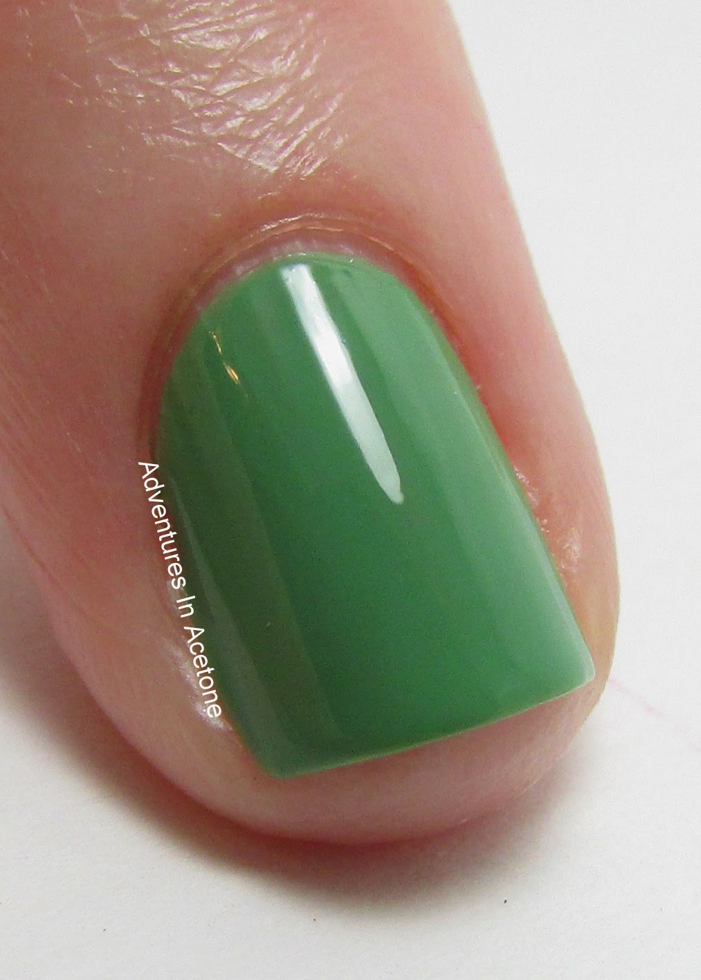 Mint Chip is the darker of the two greens in this collection. No shimmer in this one. No application issues to report. Showing two coats below with top coat.