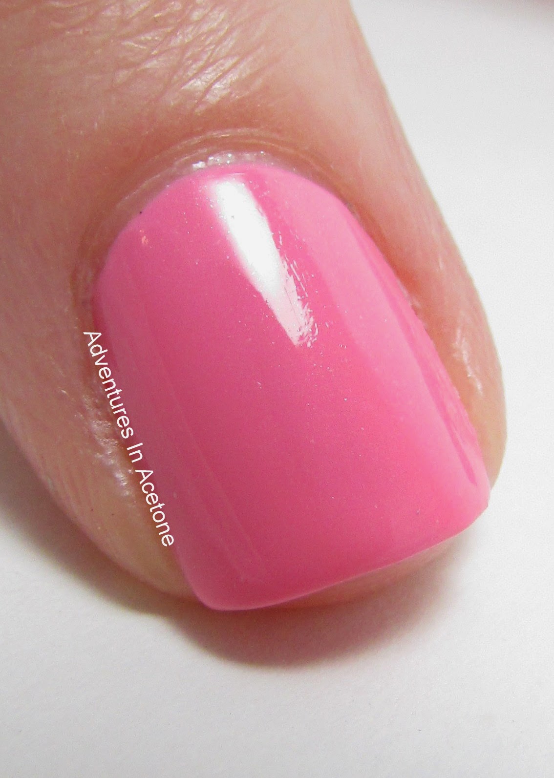Strawberry Shake is a light pink with subtle shimmer. It applied easily and I used three coats with top coat for the photo below. Two coats may work for you, it just depends on how think you apply them.