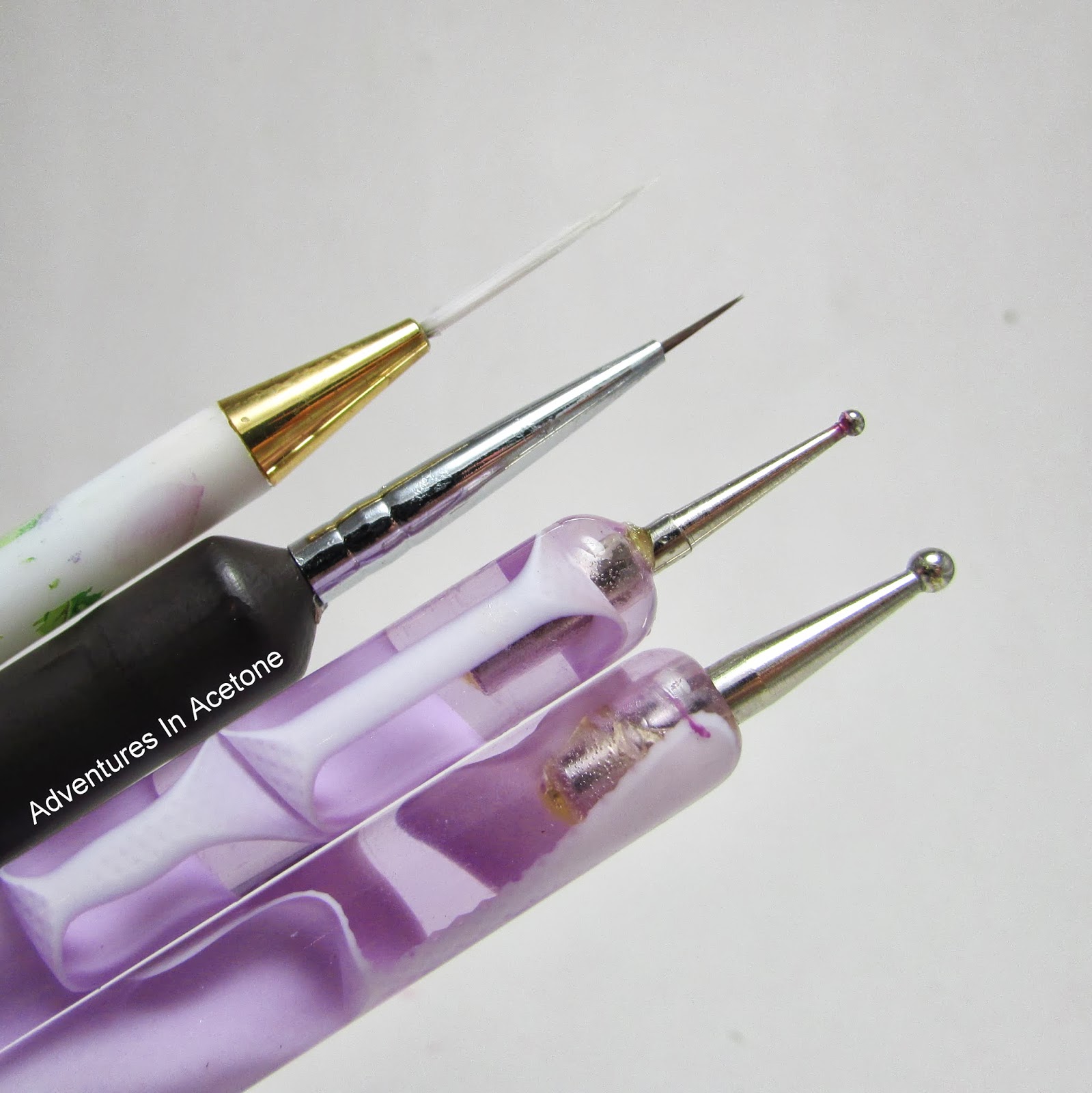 A striper brush, a detail brush, and two sizes of dotting tools.