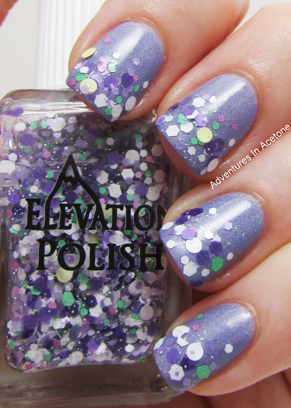 Passion Flower is a glitter topper in a clear base. It has tons of different colors and shapes of glitter including white, pink, purple, green, yellow, and iridescent. It’s a really fun pairing and looks awesome over Echinops. Since I already showed you what one coat looks like in my last post, I chose to do a glitter tip gradient with Passion Flower. Topped with one coat of top coat.