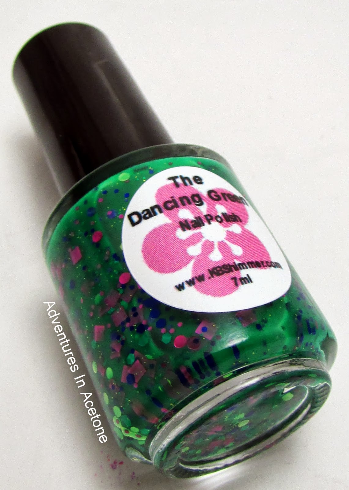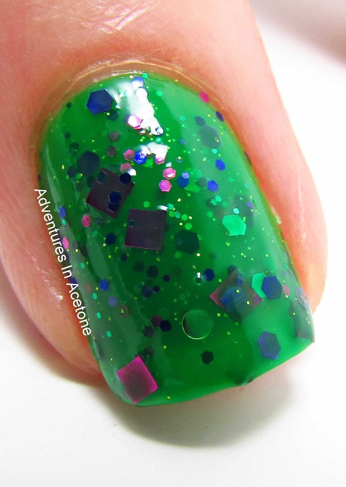 The Dancing Green is a bright green jelly polish with fuchsia squares and circles, chartreuse circles, and sapphire hex glitters. I am showing three coats below with one coat of Clearly On Top top coat. This applied easily with no issues to report.