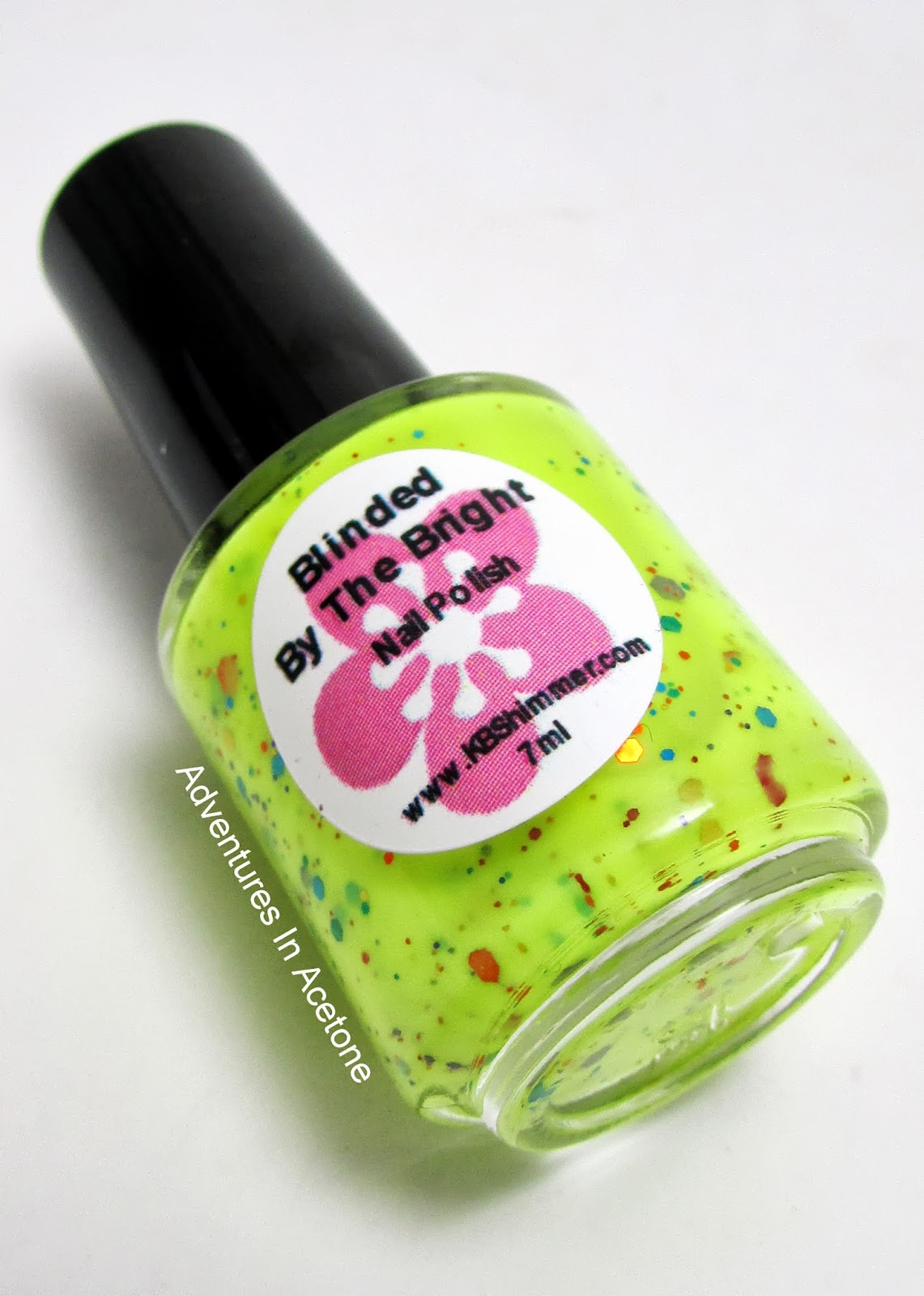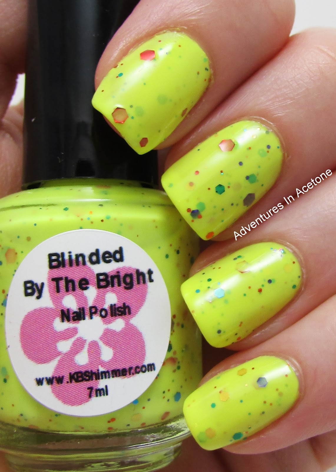 Blinded By The Bright is a super bright neon yellow crelly with mulitcolored hex glitters. I was impressed that it didn’t need a white base coat to show off the brightness. I’ve done three coats in the photos below with one coat of Clearly On Top top coat. No issues to report.