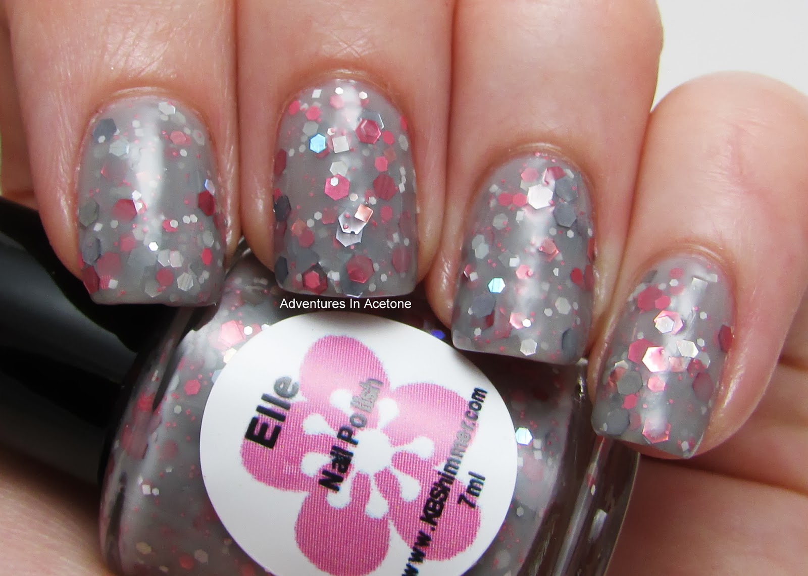 Elle is a pale gray jelly, PACKED with lots of pink, white, and gray glitters. I am showing three coats in the photos below. There is a ton of glitter in this polish so I applied two coats of Clearly On Top top coat to smooth the surface. No issues to report. I have always been a fan of pink and gray together so I was really excited to receive this in my package!
