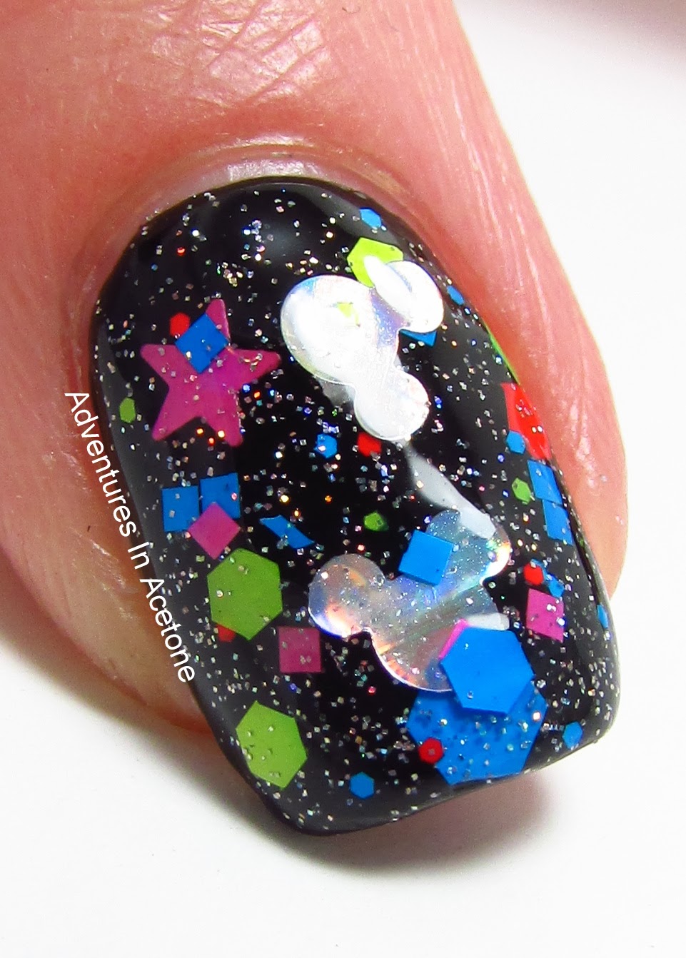 The final Mickey inspired polish is called Pop Art Mickey. It is described as “mouse shaped silver holo glitters, mixed with neon pink and neon green stars, and various sized hex and square glitters in neon pink, neon green, neon blue and red, sprinkled with micro holo glitter in a clear base.” I’ve layered two coats over a plain black creme with top coat. I love how it made the neons pop and the holo glitter sparkle. I’ve paired it with some simple pop art inspired nail art as well in coordinating colors.