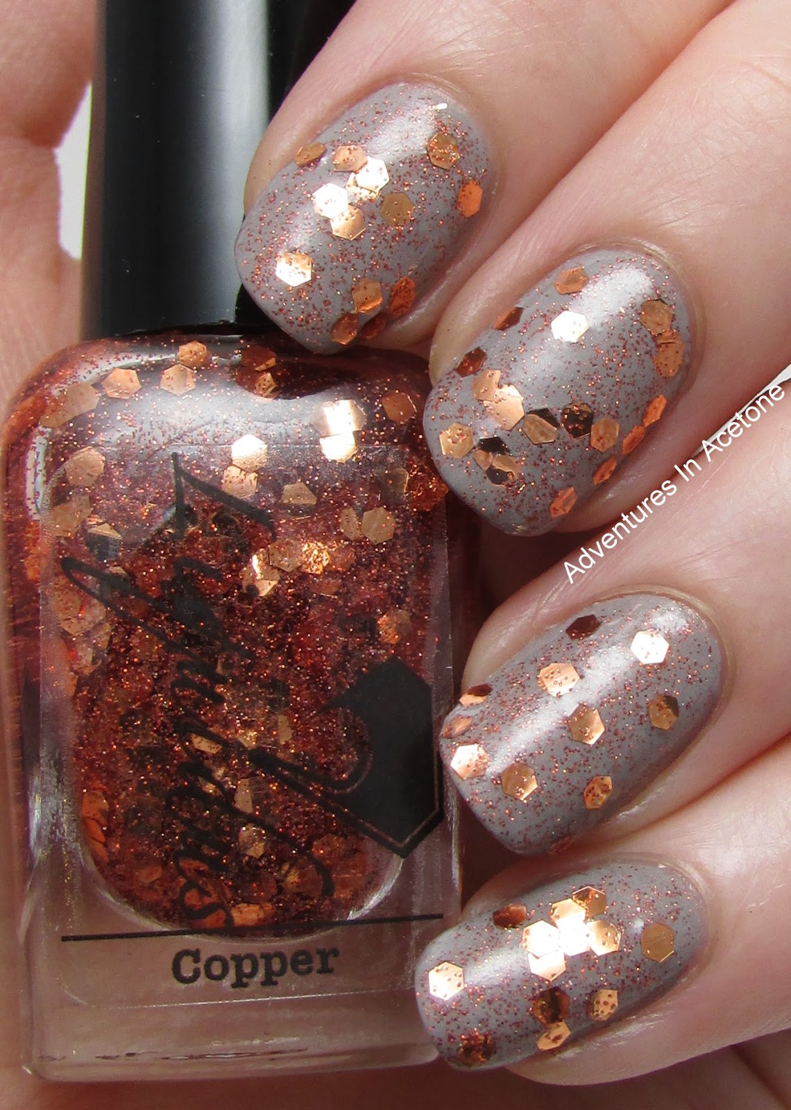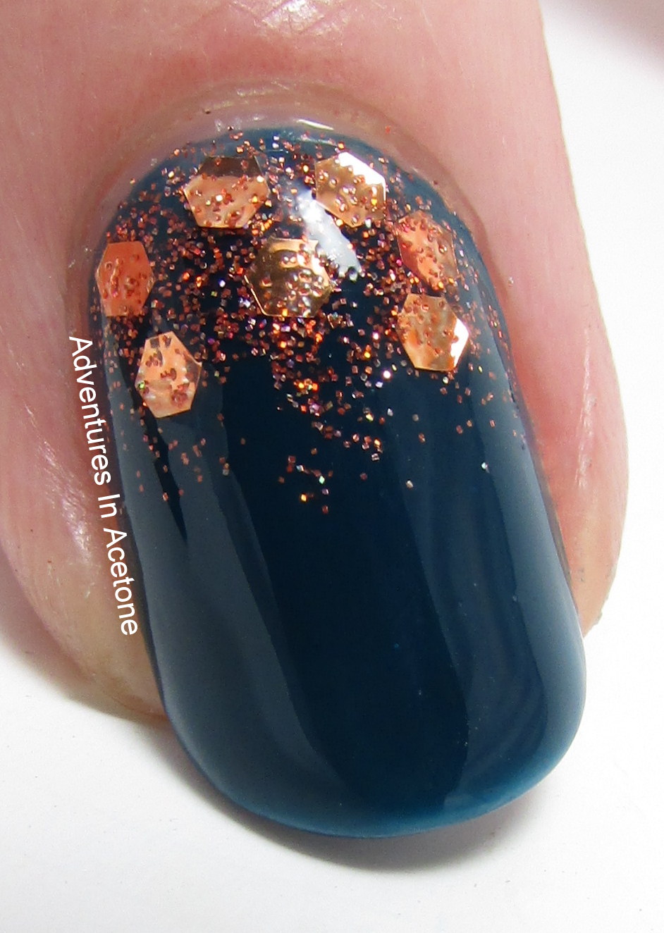 I knew Copper would look great over both Arsenic and Blue Diamond Turquoise, so you will see it paired with both! First, I’ve done one coat over Arsenic. Copper is “inspired by the bright red-orange mineral. It is a glitter bomb with copper colored hexes and microfine holo glitter in a clear glossy base.” This polish is packed with glitter! You may even end up brushing some off before applying to your nails. I’m showing only ONE coat below with top coat. I love that the microfine copper glitter is holo!