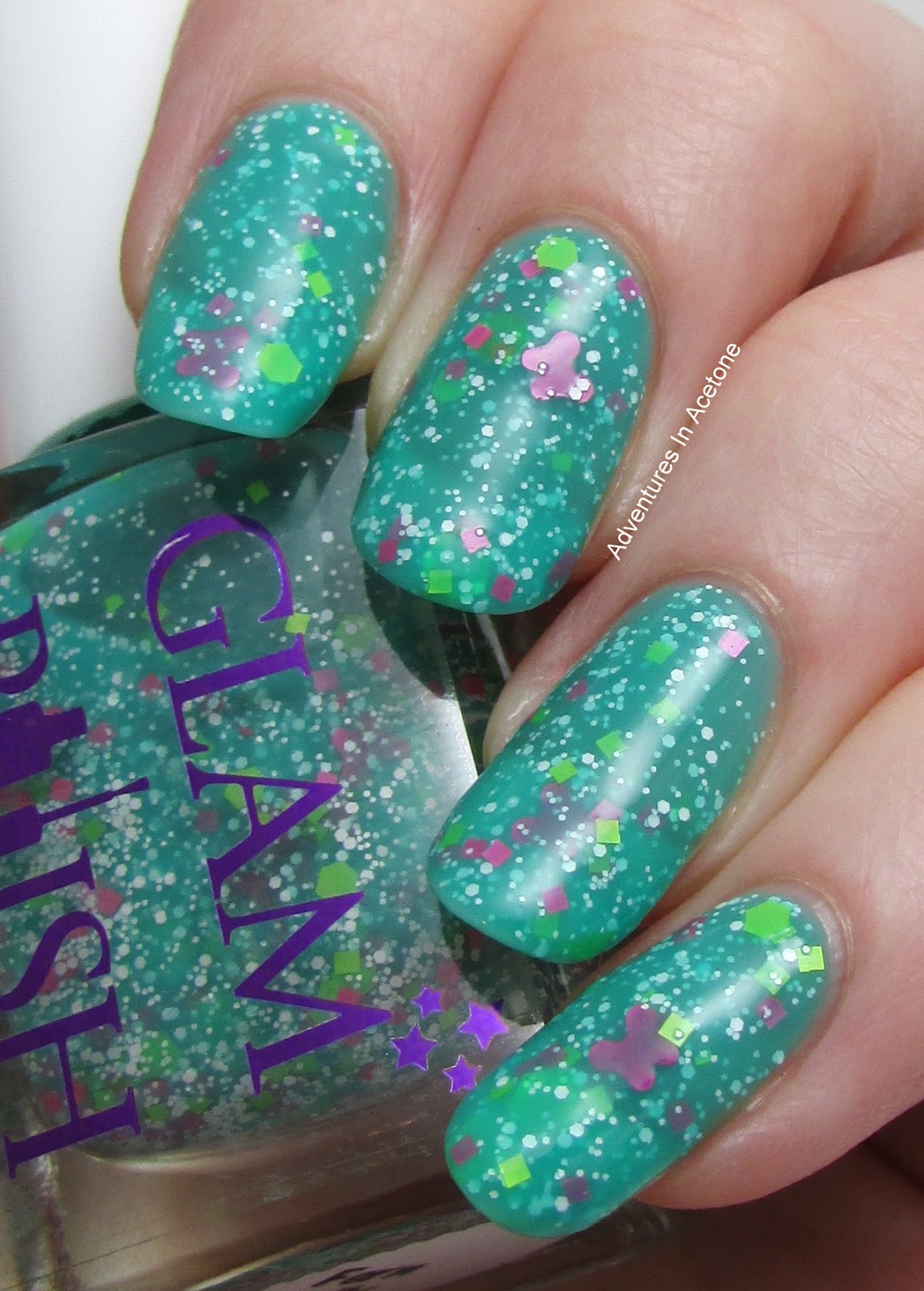 Fern Gully is also from the Me Oh My collection inspired by all things cute and fun! It is a turquoise jelly base with neon green hexes and squares, neon pink squares and butterflies (!!!), small and micro white glitter. This was one of my all time favorite movies growing up so I was really excited to receive this one in my review package. I’m showing 2 coats below with top coat. It’s less blue toned in person compared to my pictures.