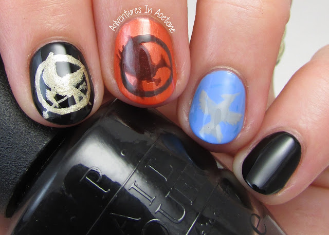 - Index: two coats of OPI Black Onyx and China Glaze Passion for the mocking jay detail.